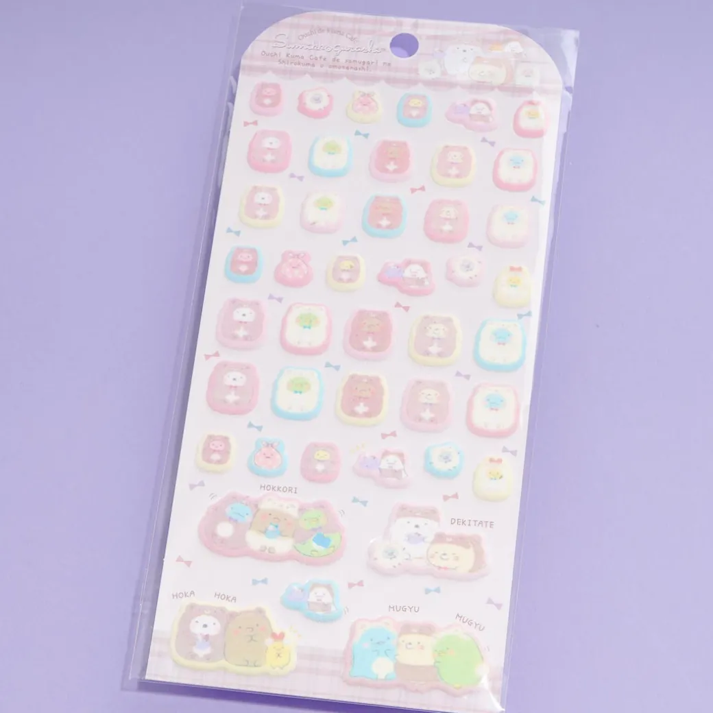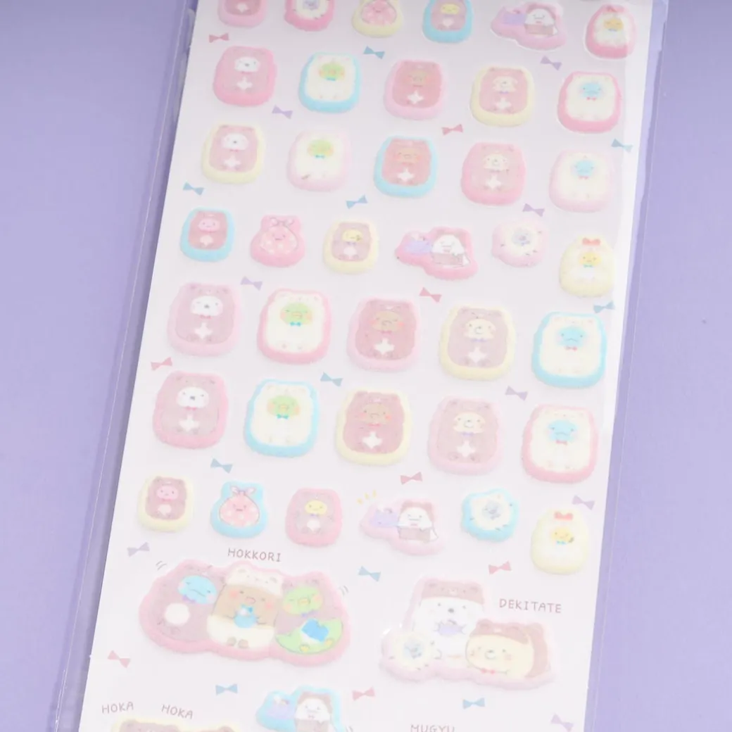 Add a dose of cuteness to your phone case by placing these puffy stickers! The sheet has die-cut seals featuring illustrations of the Sumikko Gurashi gang all dressed up in bear onesies.