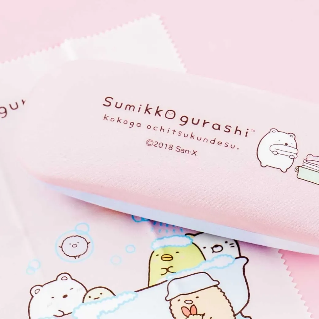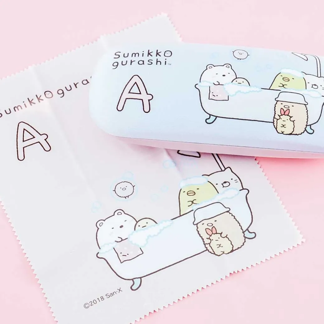 - A hard case for eyeglasses featuring prints of a big letter A and the Sumikko Gurashi characters taking a bath together