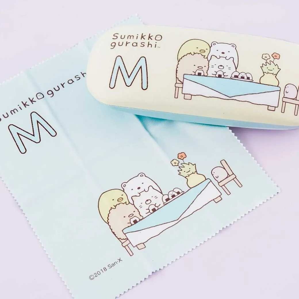 - A kawaii eyeglass hard case with illustrations of the Sumikko Gurashi gang eating together and a large letter M