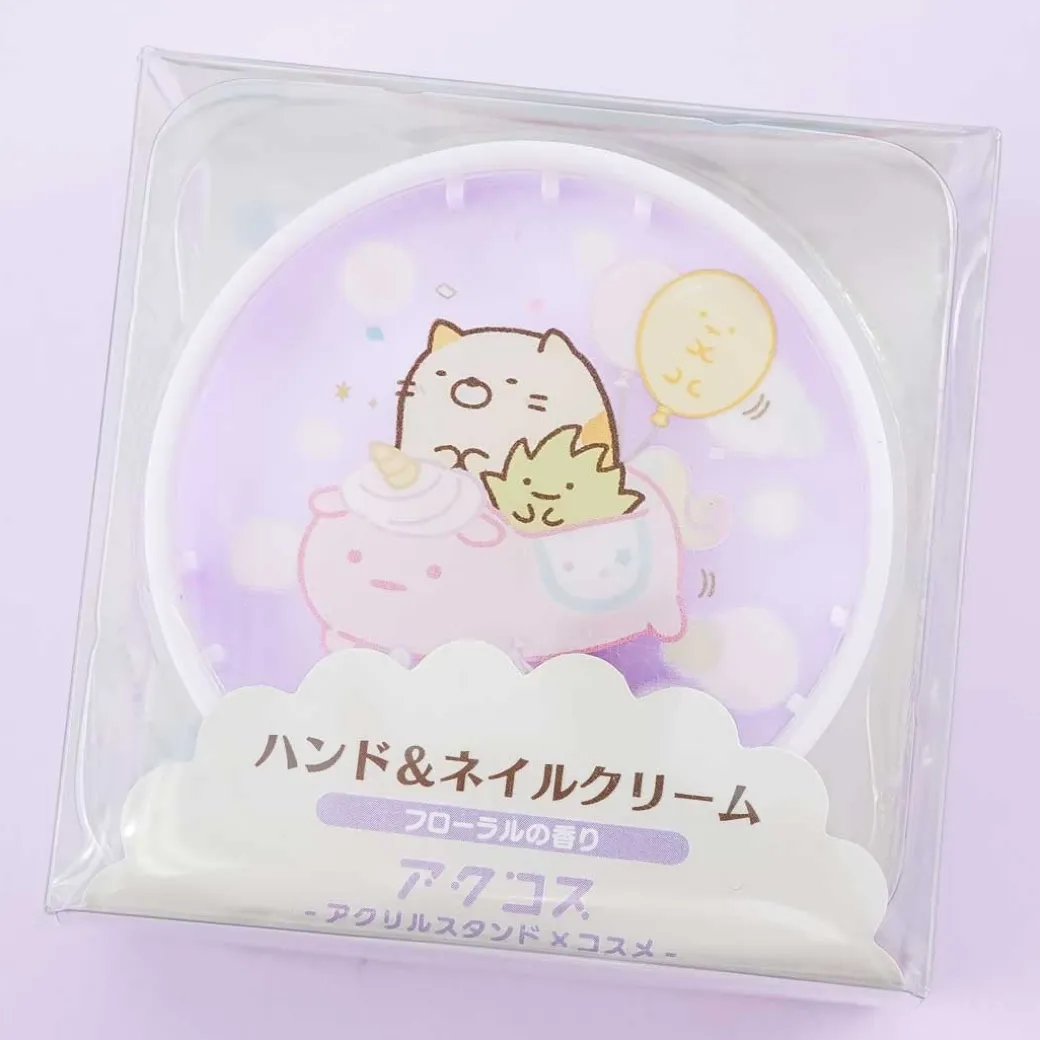 - A moisturizing hand and nail cream in a kawaii round compact case featuring Neko with Zassou from Sumikko Gurashi