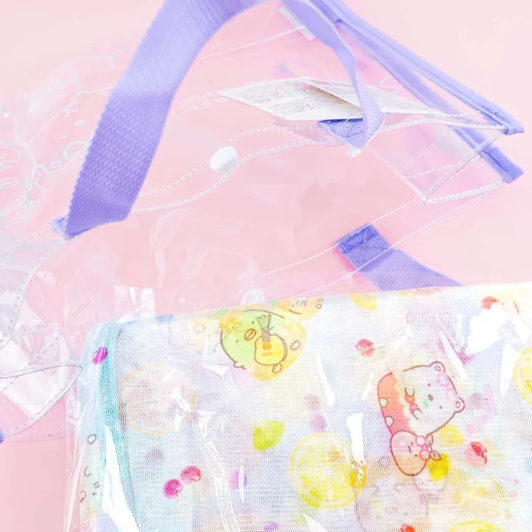 - A kawaii clear vinyl tote bag illustrated with the Sumikko Gurashi carrying flowers and fruits