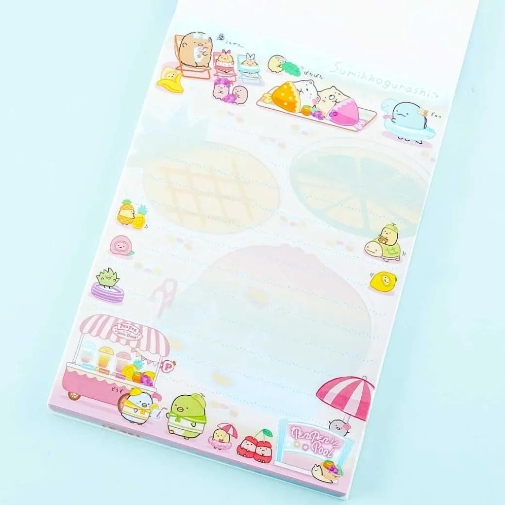 - A kawaii memo pad featuring prints of the Sumikko Gurashi gang with a large fruit parfait
