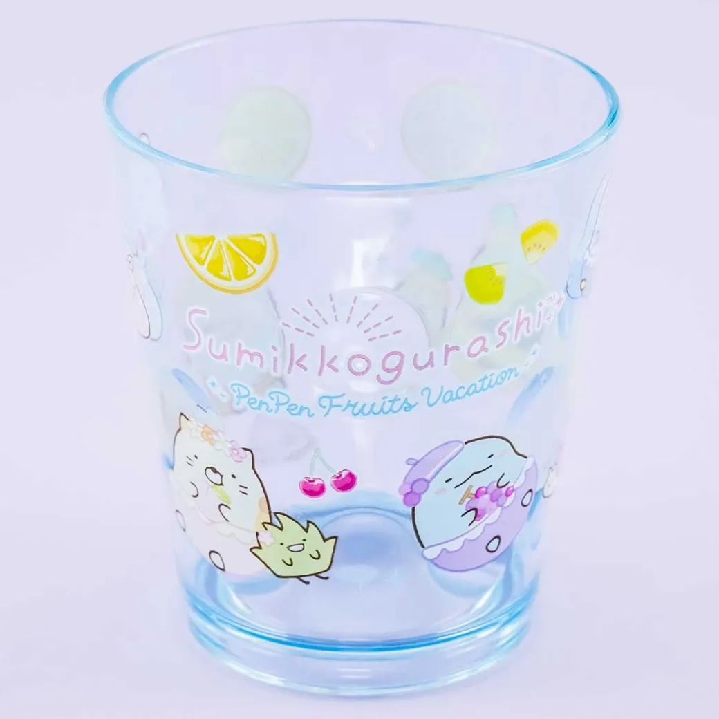 - A kawaii acrylic cup illustrated with the Sumikko Gurashi playing with fruits