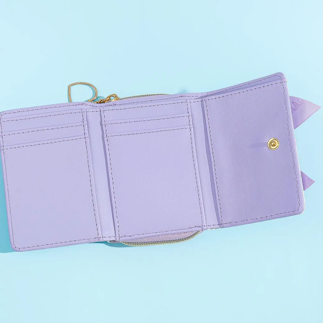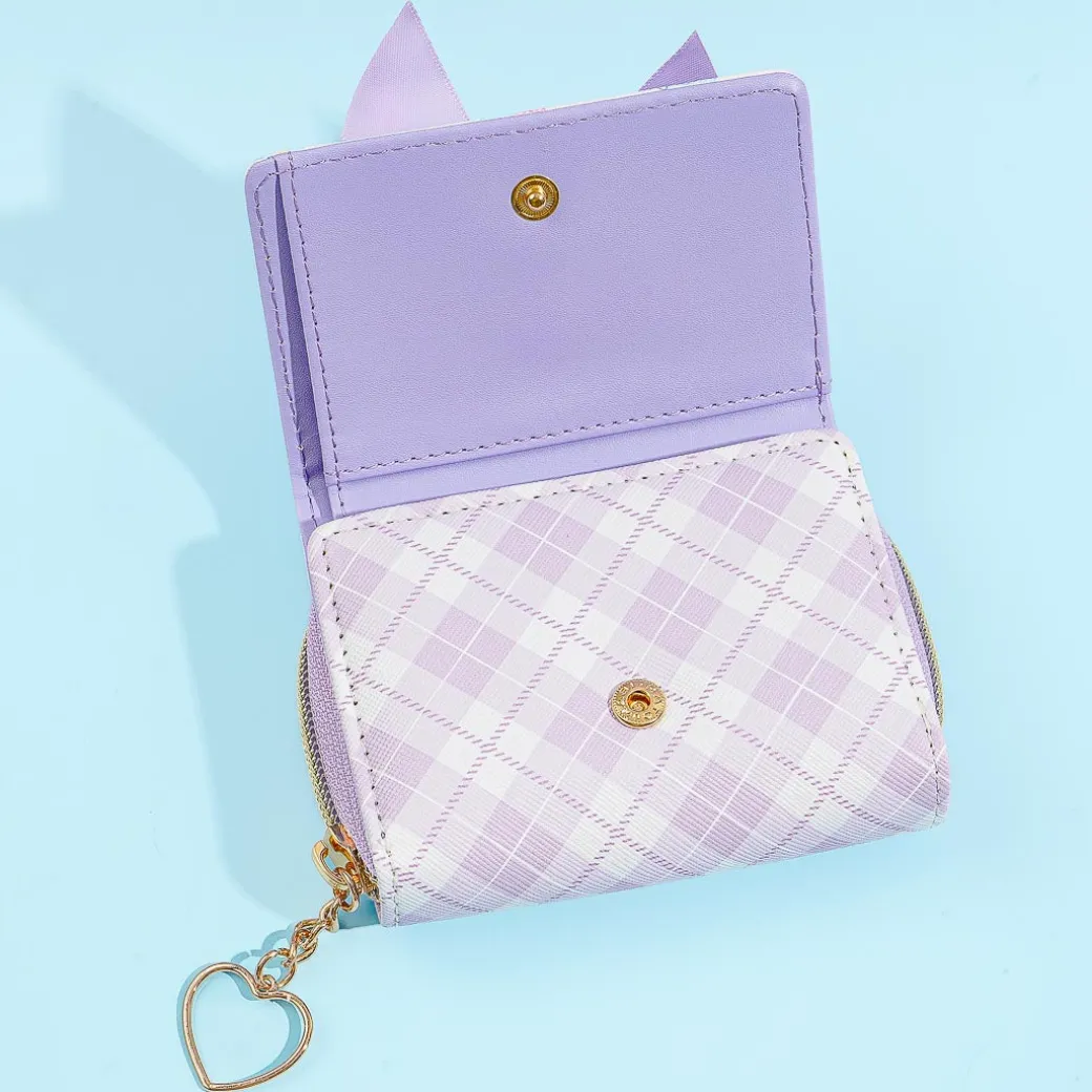Keep your IDs, train passes, receipts, and loose change safe by placing them all inside this super cute purple tri-fold wallet! It has cute prints of the Sumikko Gurashi characters and plaid patterns. The front has a huge ribbon with a diamond charm and the back has a dedicated zippered coin purse!
