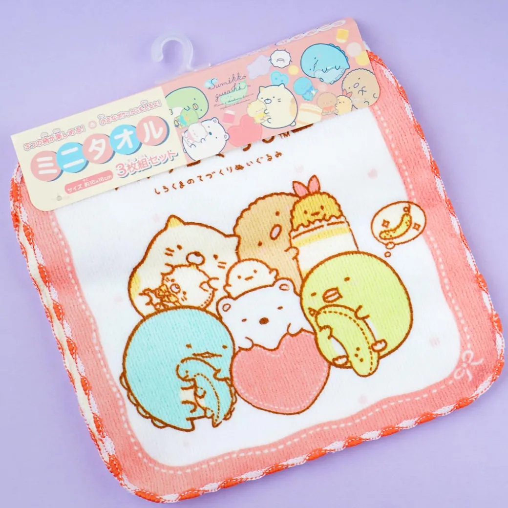 Wipe your hands kawaii-style with this mini towel set! It has cute illustrations of Sumikko Gurashi characters playing with their plushies.