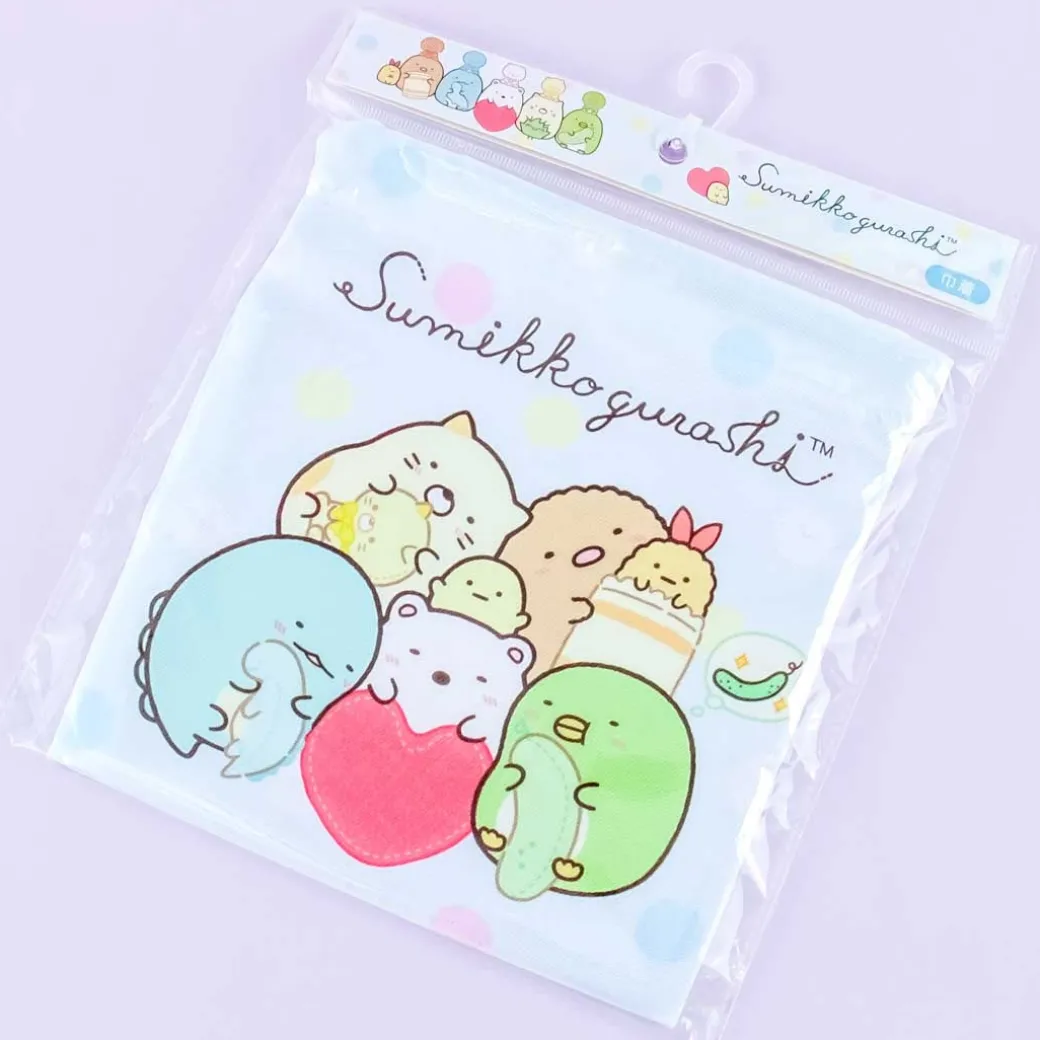 - A drawstring bag with illustrations of Sumikko Gurashi characters sewing plush toys