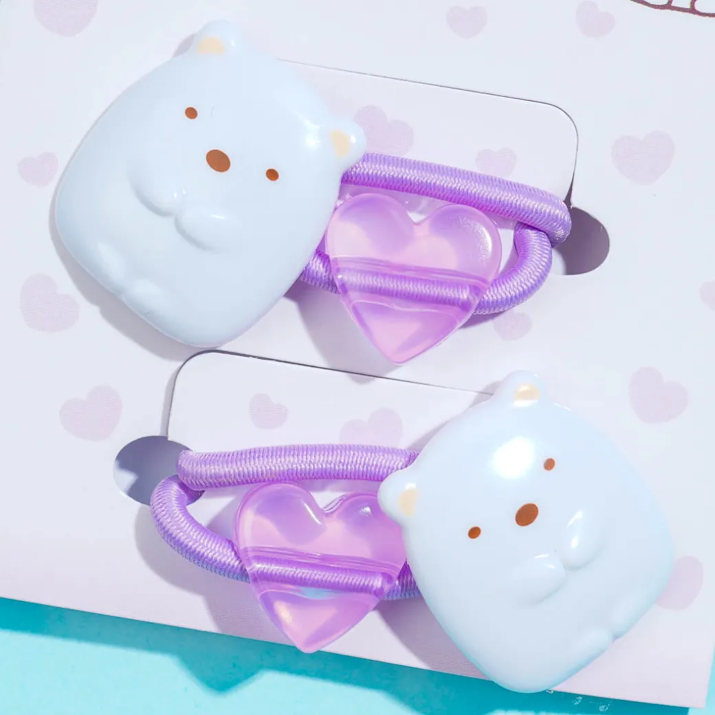 Look super kawaii in pigtails by using this cute pair! Each hair tie has both a purple heart and a Shirokuma bear charm.