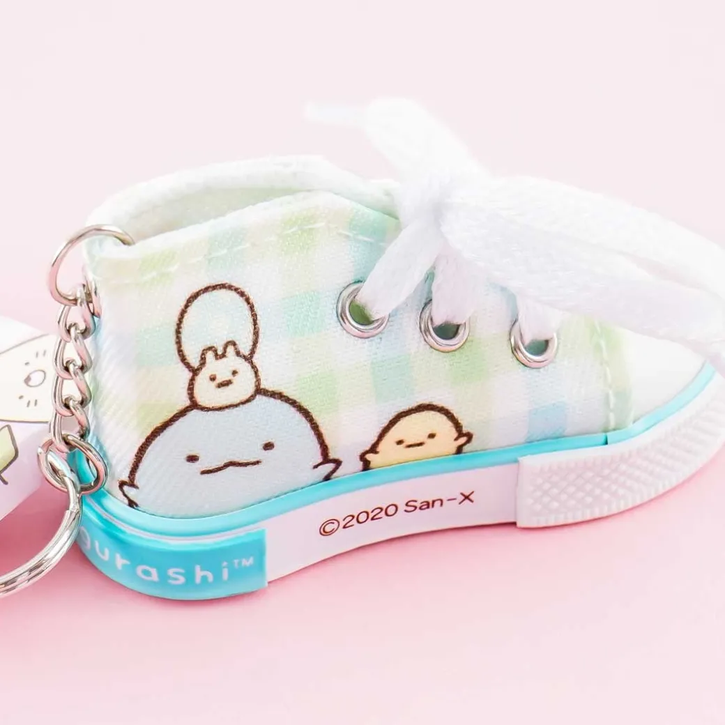 - A cute checkered sneaker keychain featuring the Sumikko Gurashi characters reading together