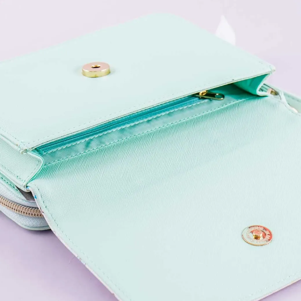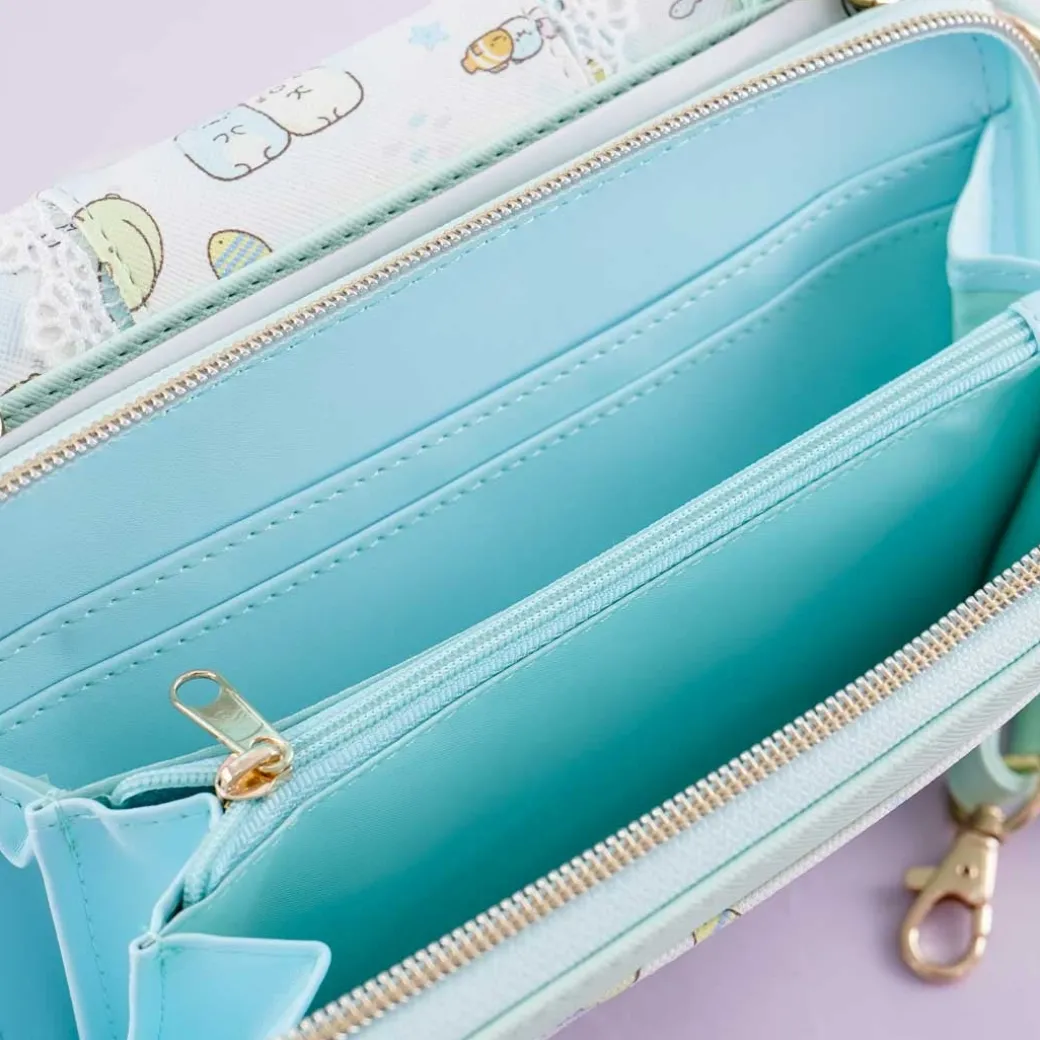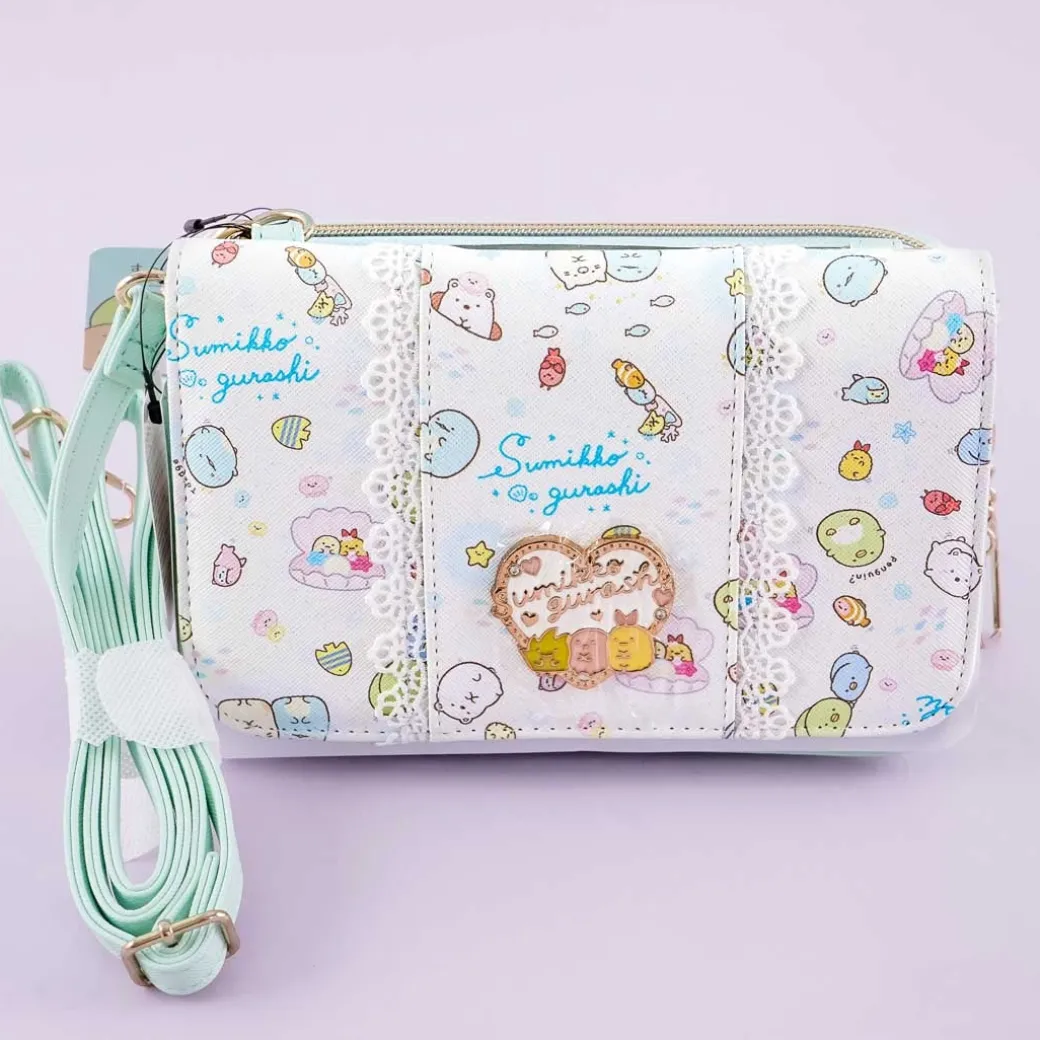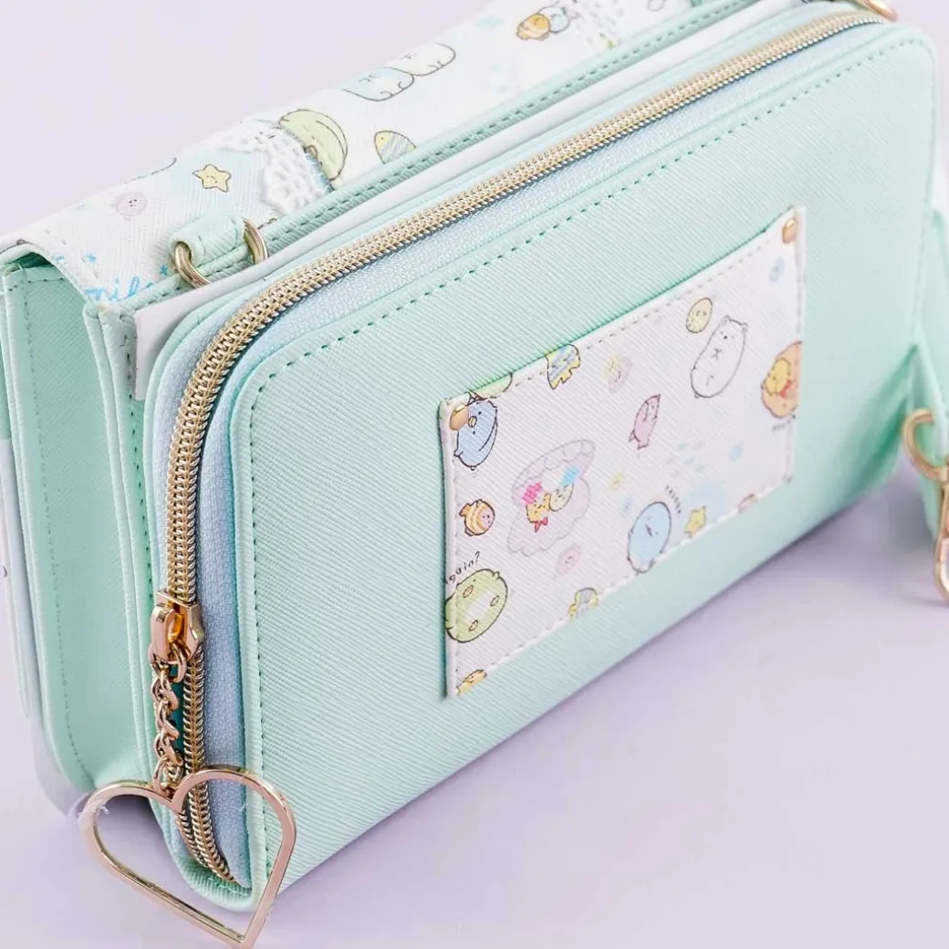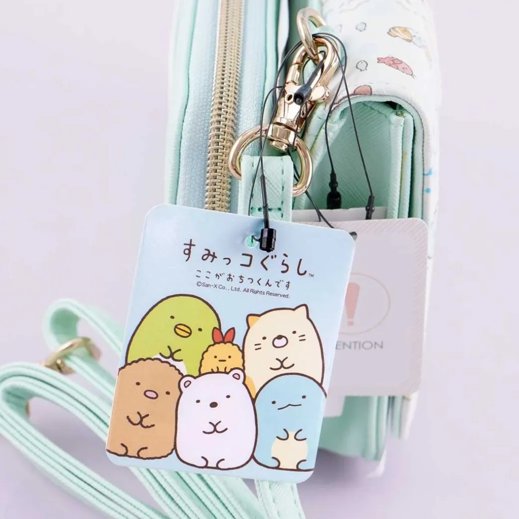 - A kawaii sling bag that has an attached mint green wallet with illustrations of the Sumikko Gurashi characters exploring under the sea