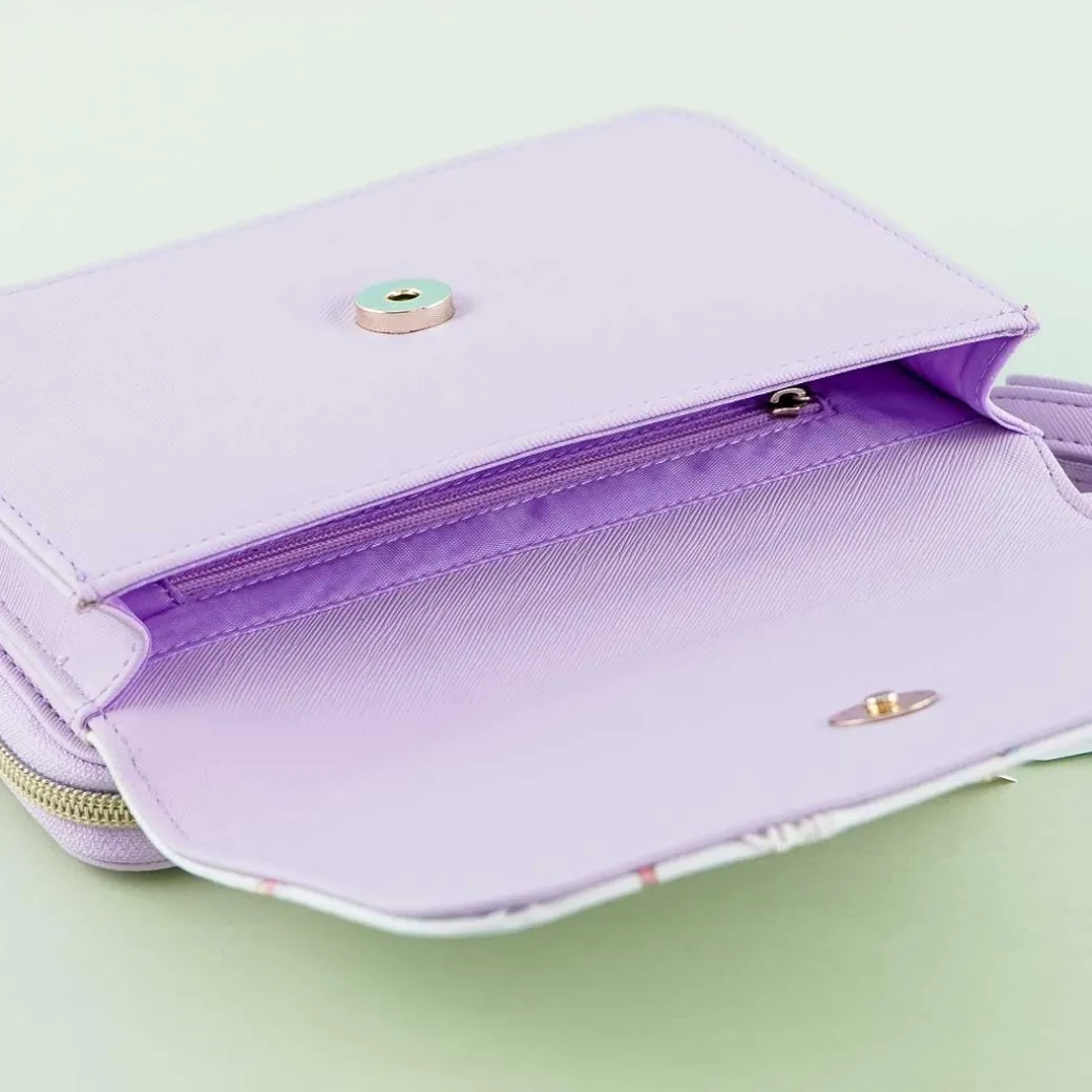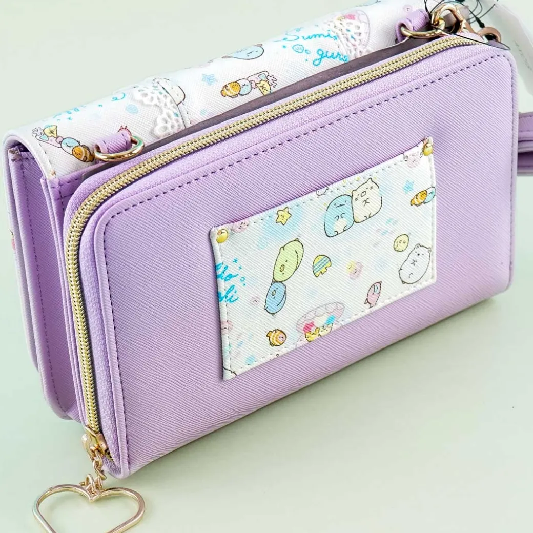 - A super cute sling bag that has an attached purple wallet decorated with prints of the Sumikko Gurashi characters while under the sea