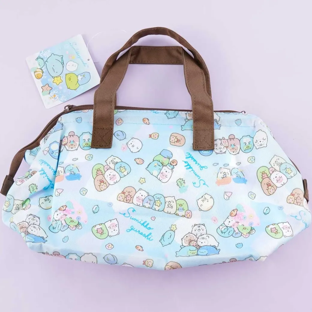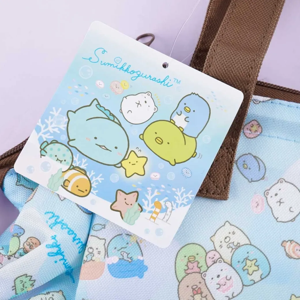 - A cute lunch bag with a wide-mouth opening featuring the Sumikko Gurashi characters having adventures under the sea