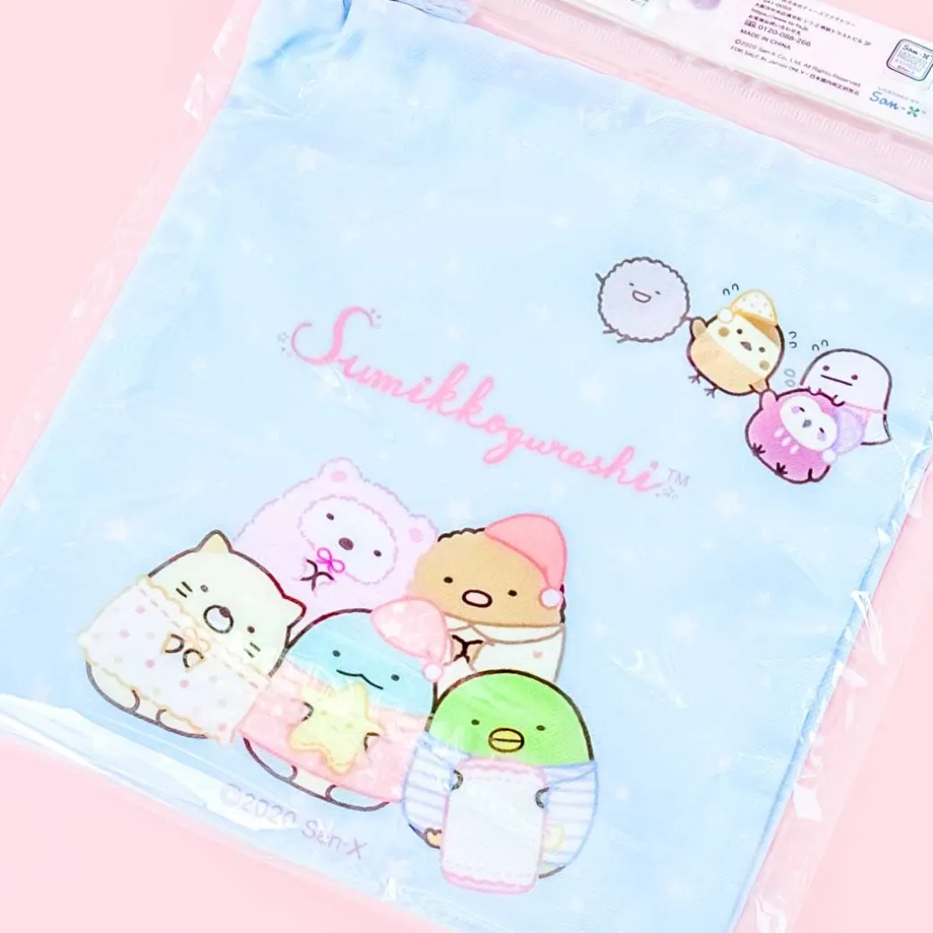 - A drawstring bag featuring the Sumikko Gurashi gang having a pajama party