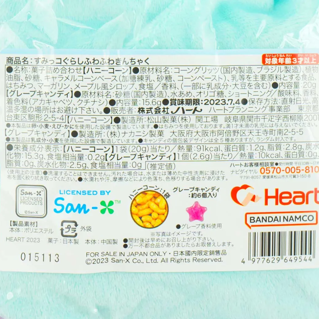 Take this special pouch with you so you won’t go hungry while traveling! It has a cute print of a Sumikko Gurashi character’s face and contains a pack of crunchy snacks and yummy grape candies. Just pull the strings to secure the contents inside.