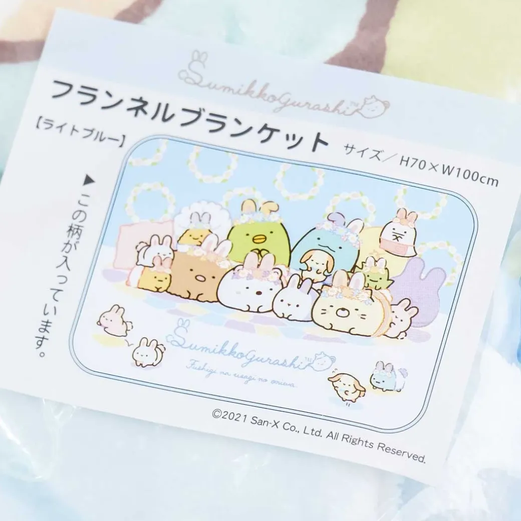 - A super cute flannel blanket featuring Sumikko Gurashi characters in spring bunny costumes