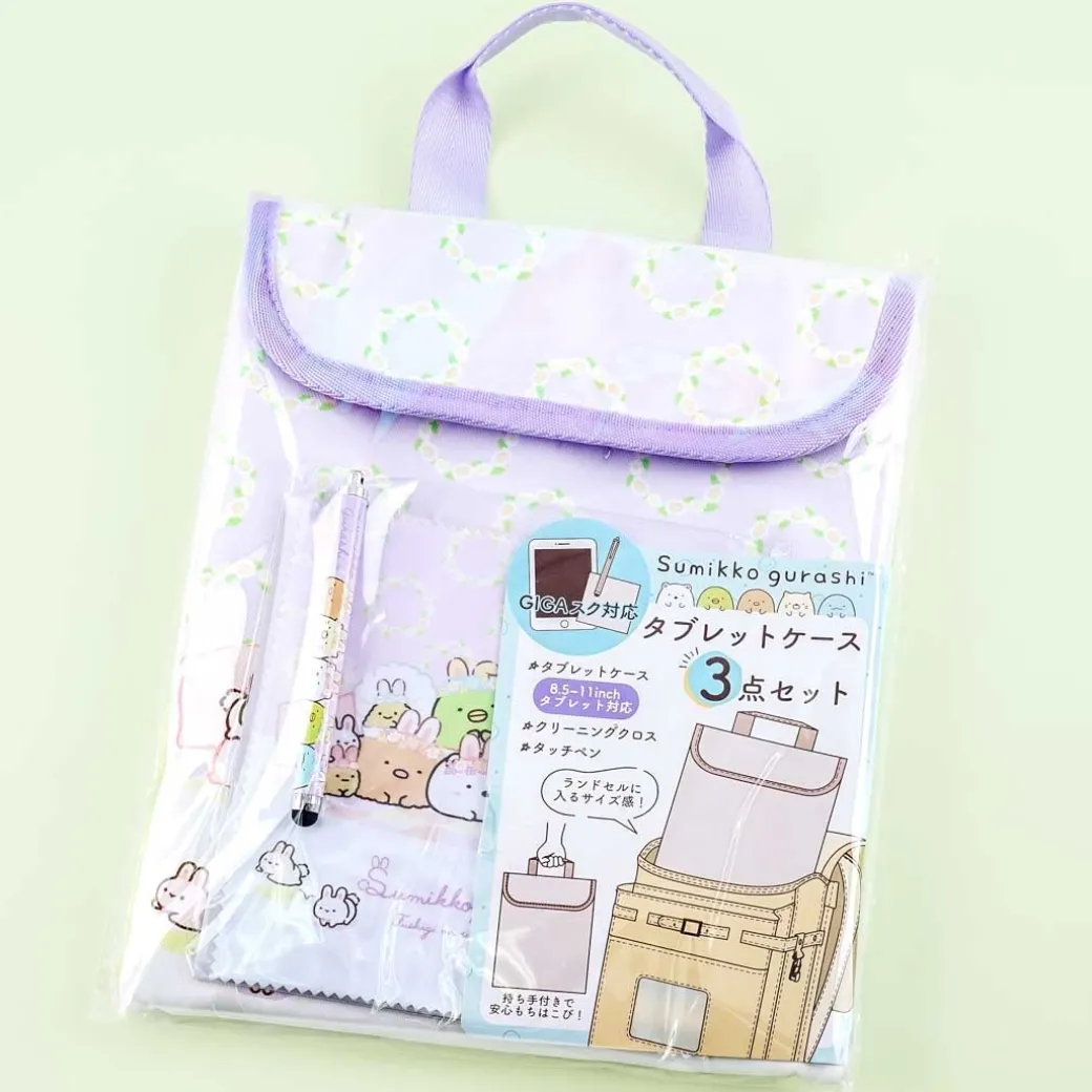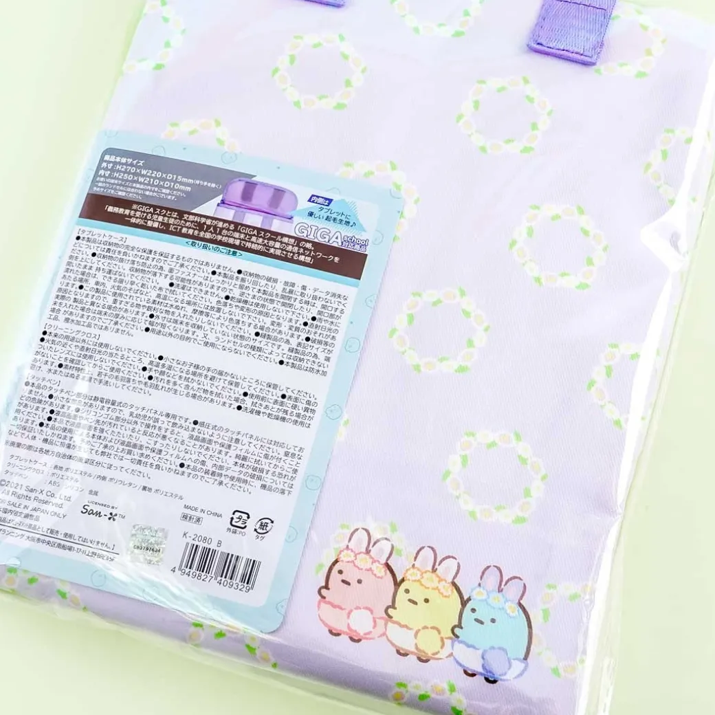 - A cute bag-type tablet case set with prints of the Sumikko Gurashi gang dressed as bunnies with lots of flowers