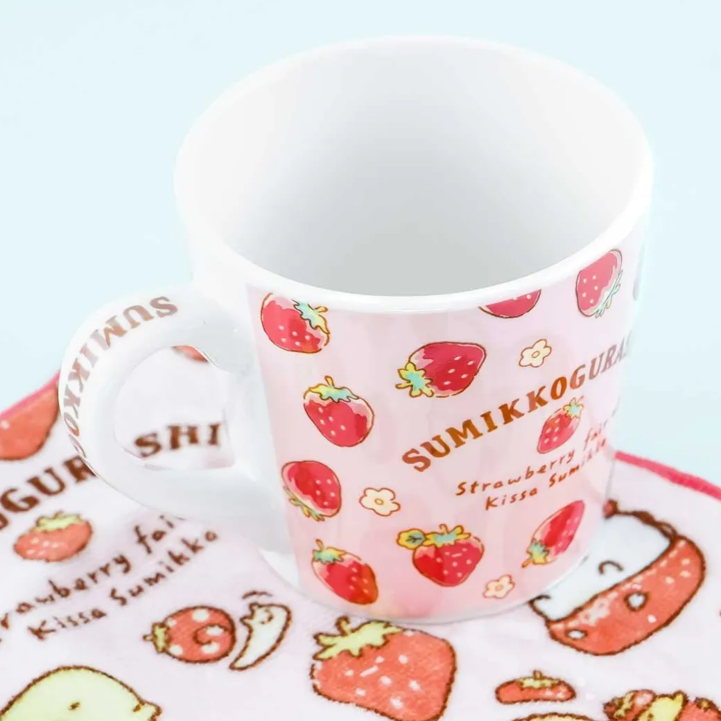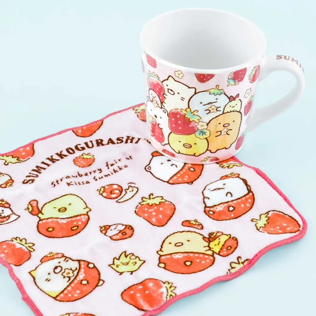 - A cute mug and towel gift set featuring the Sumikko Gurashi gang in strawberry costumes