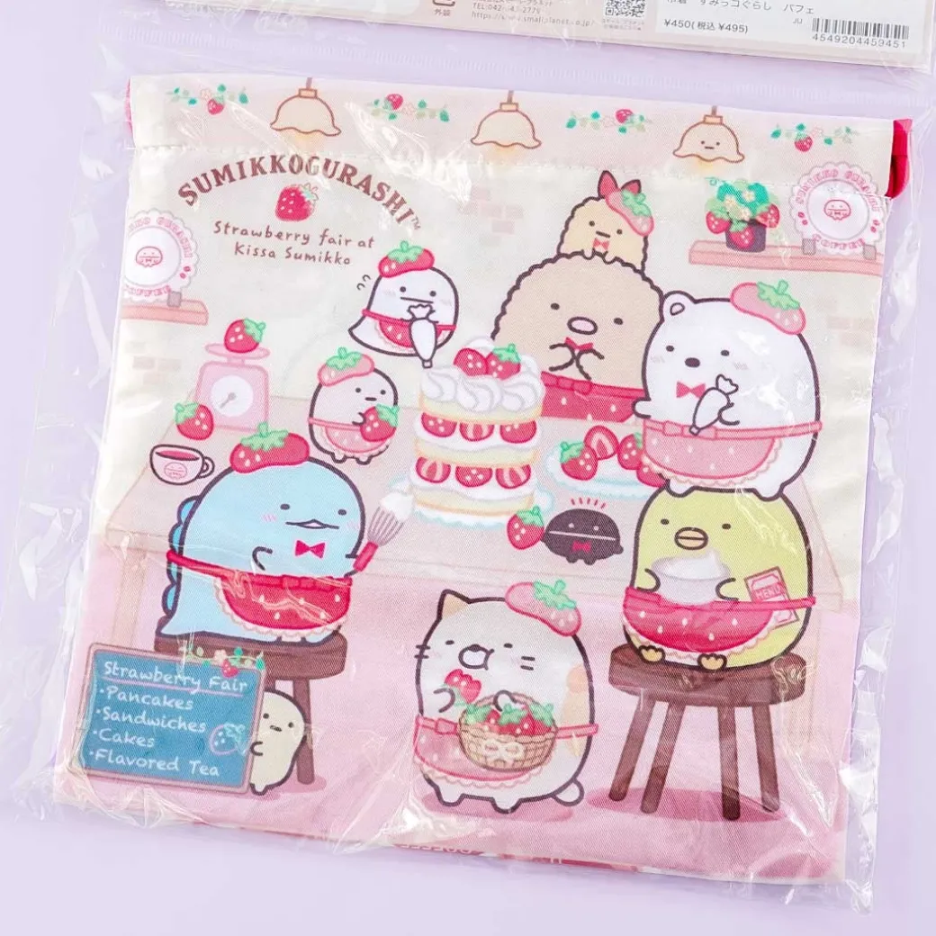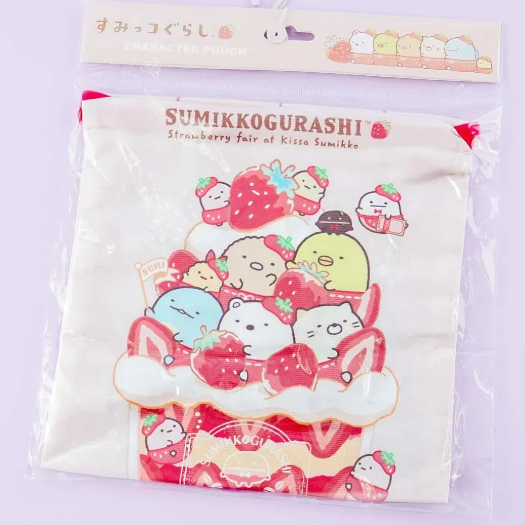 - A kawaii drawstring pouch featuring the Sumikko Gurashi gang on a giant strawberry parfait