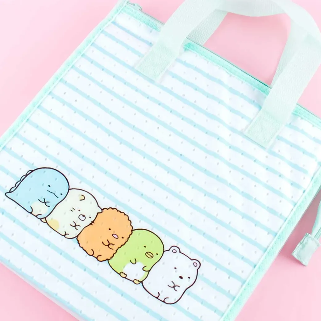 - A kawaii zippered lunch bag featuring prints of the Sumikko Gurashi stacked on top of each other with a striped background