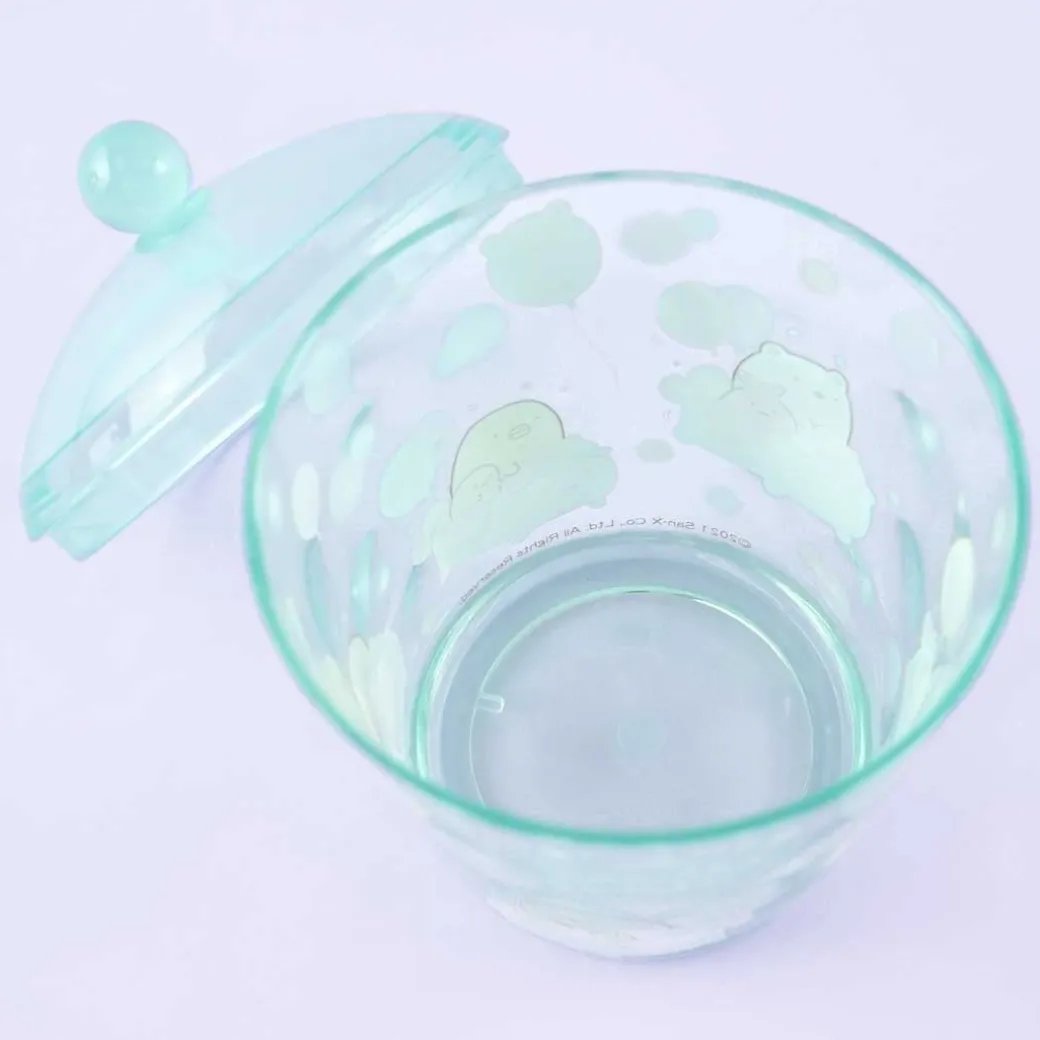 - A kawaii transparent canister decorated with an illustration of the Sumikko Gurashi characters at the Tapioca Park