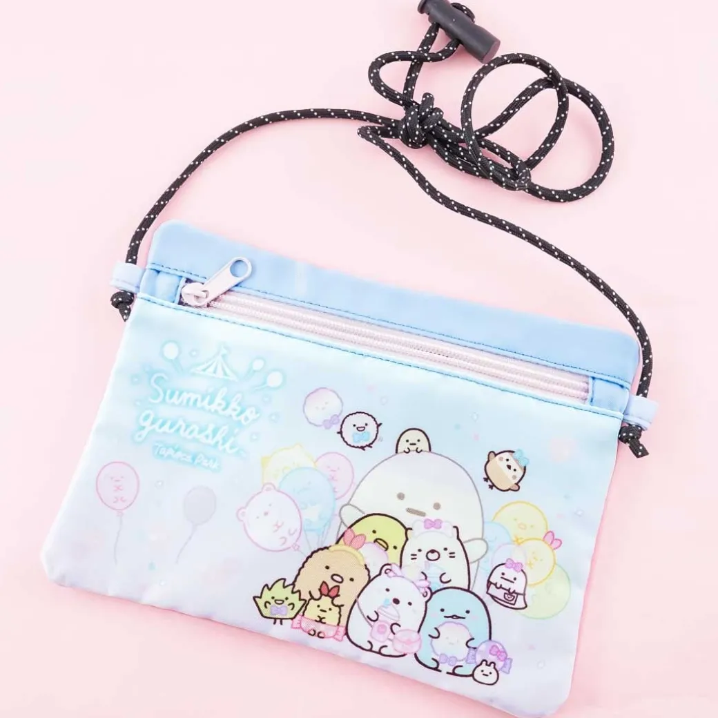 - A cute shoulder bag covered in prints of the Sumikko Gurashi with candy, balloons, and other cute items