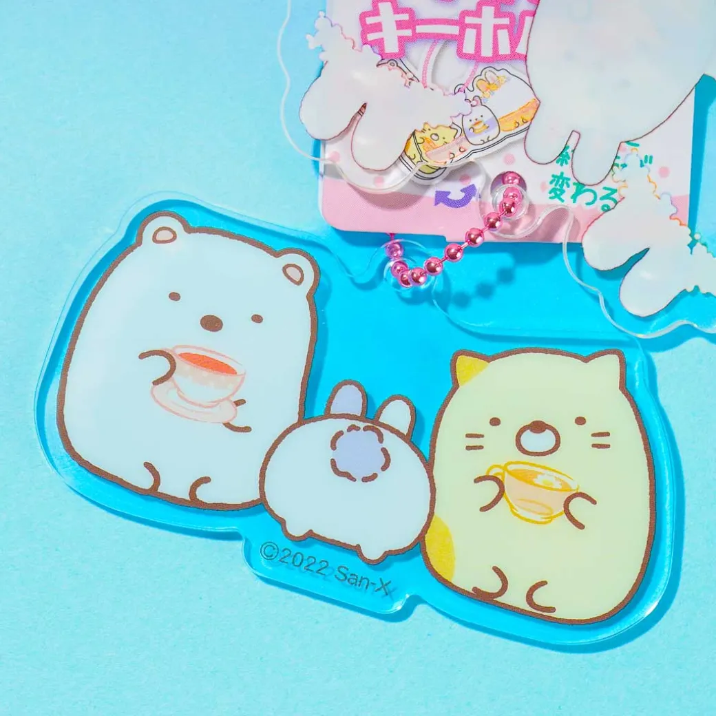 Watch as the Sumikko Gurashi characters get ready for a tea party with this kawaii acrylic key holder! It comes with two charms that change their appearance when you stack them together.