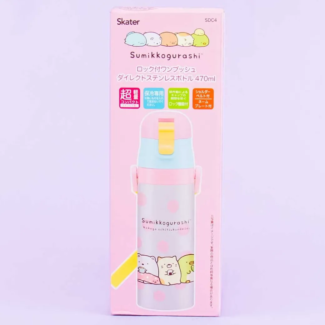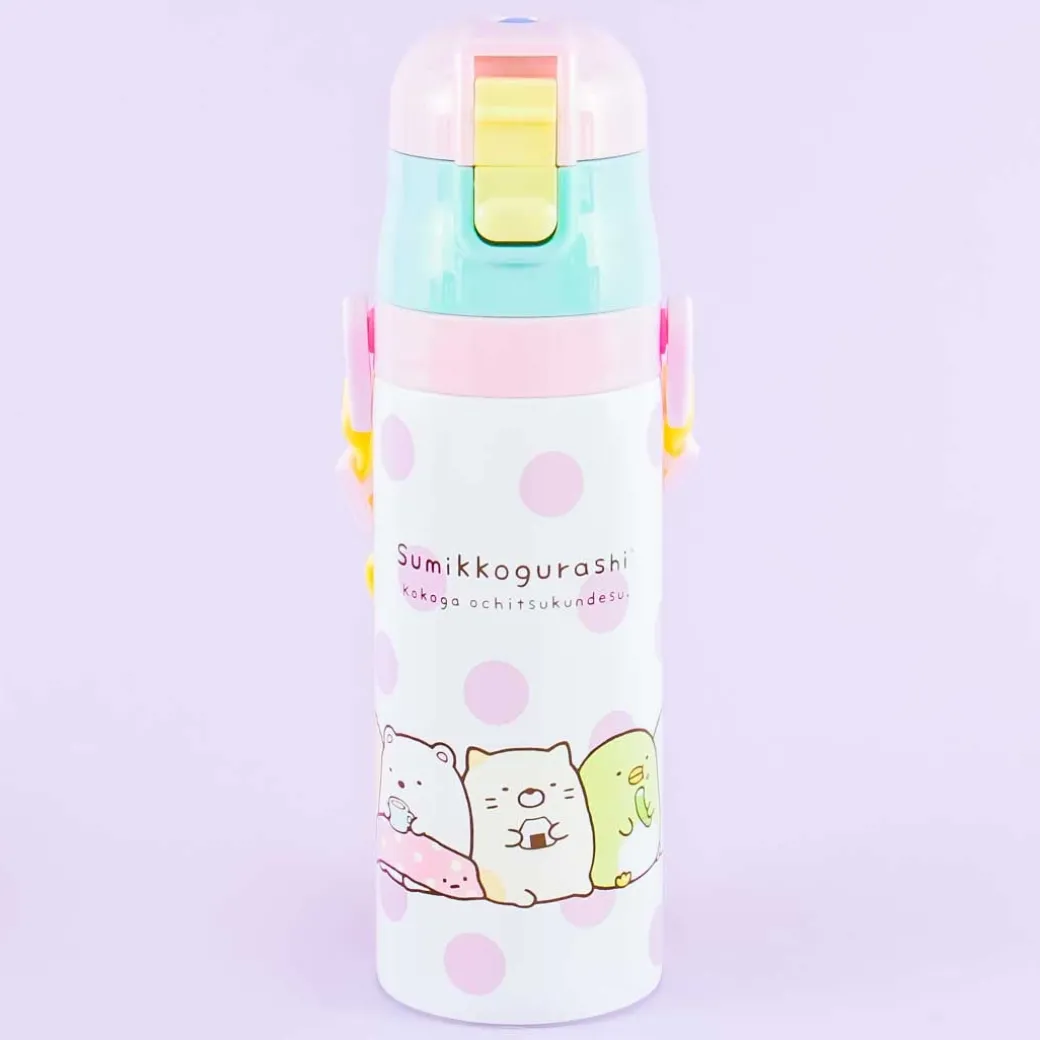 - A super kawaii wide-mouth stainless steel bottle illustrated with the Sumikko Gurashi eating and drinking tea