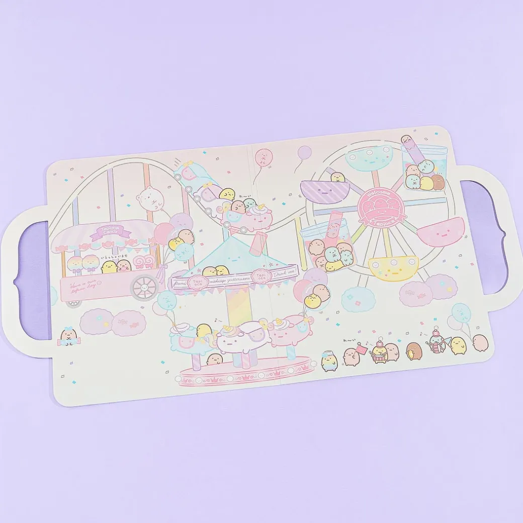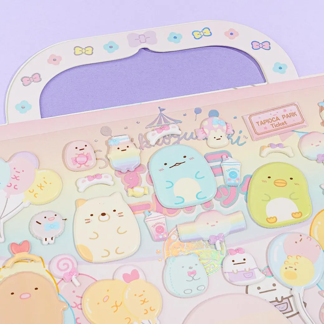 Have fun playing with this sticker book. It showcases the Sumikko Gurashi gang having fun at a theme park! This sticker book is shaped like a bag so you can take it wherever you go. Open the book and have fun mounting the stickers wherever you like!