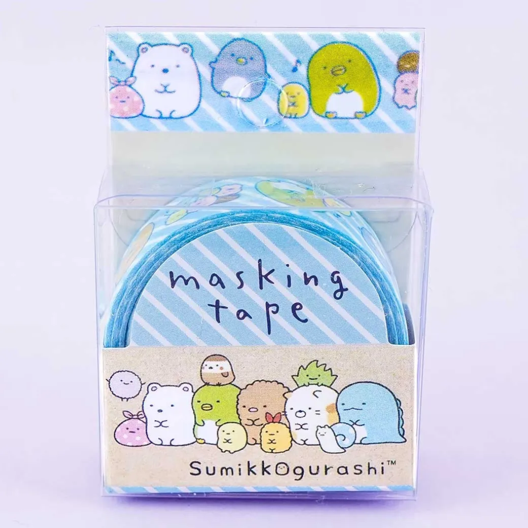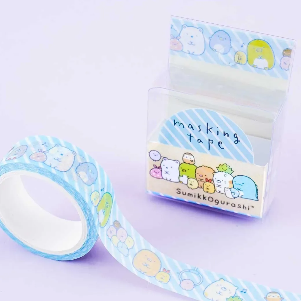 - A roll of deco tape featuring the Sumikko Gurashi characters and diagonal stripes