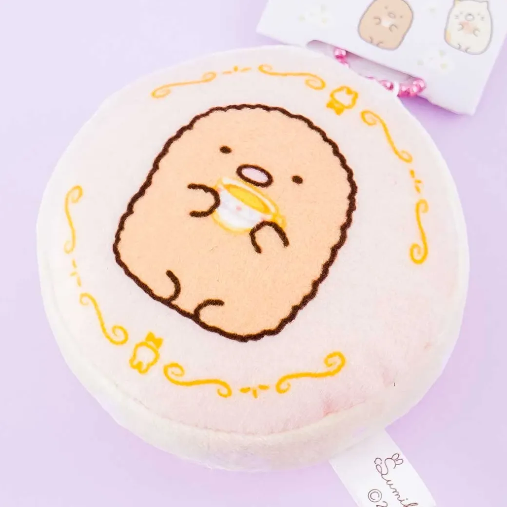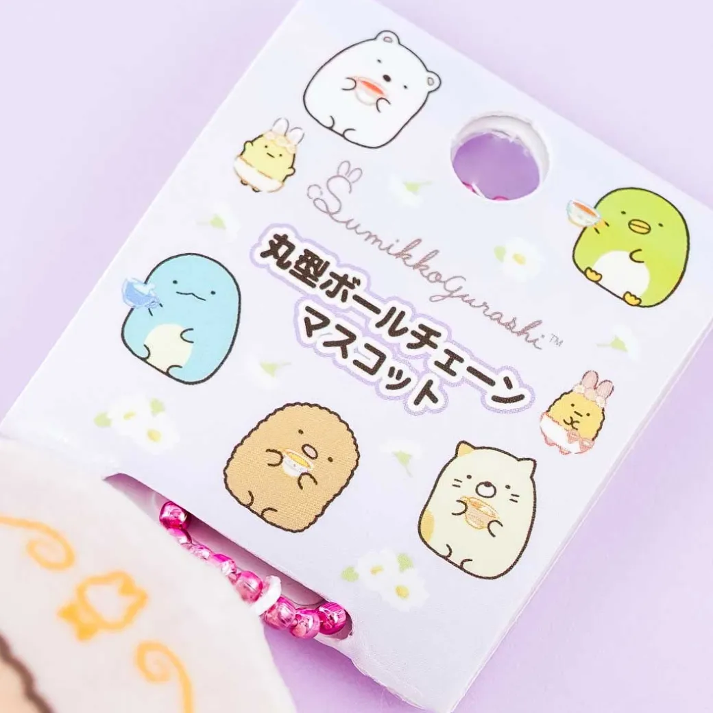 - A super cute round plushie charm showcasing a print of Tonkatsu from the Sumikko Gurashi having tea