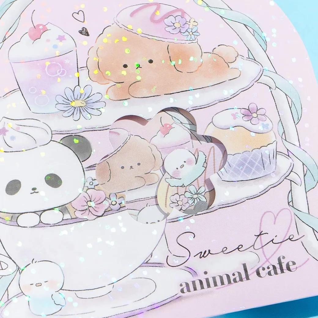 Decorate your notebook covers with this glittery pack of mini sticker flakes. It showcases kawaii baby animals playing with cafe treats! Add these stickers to your stationery collection.