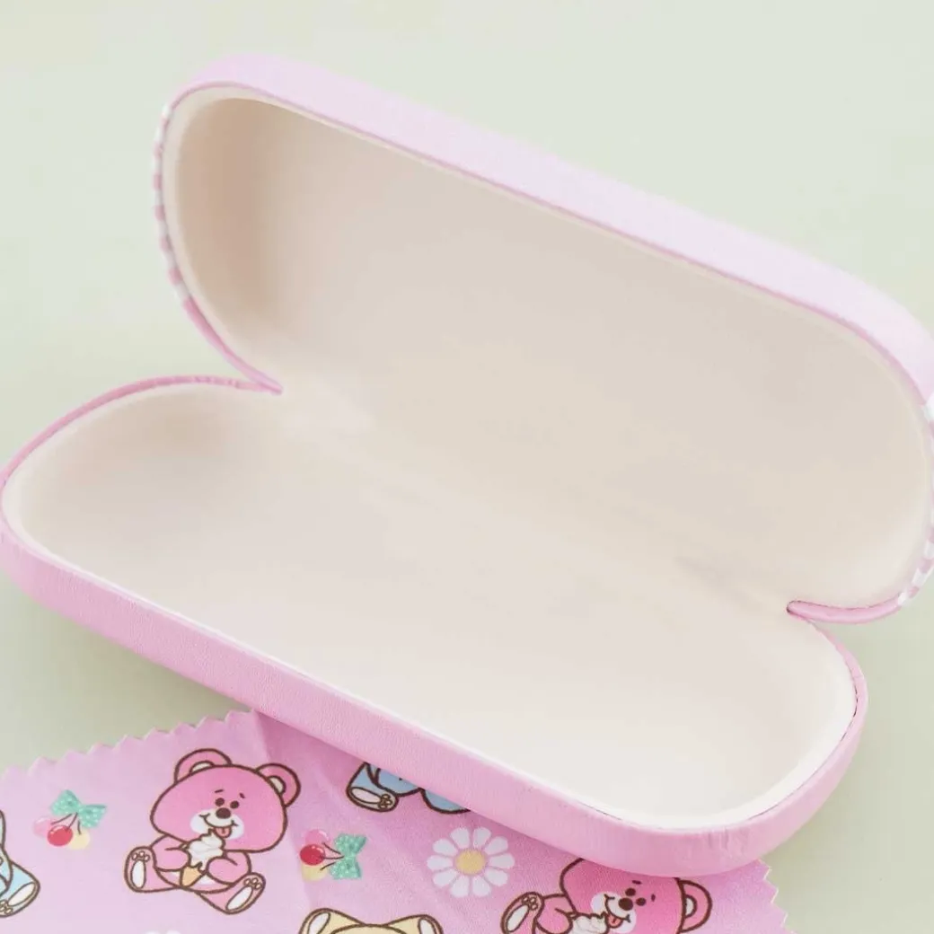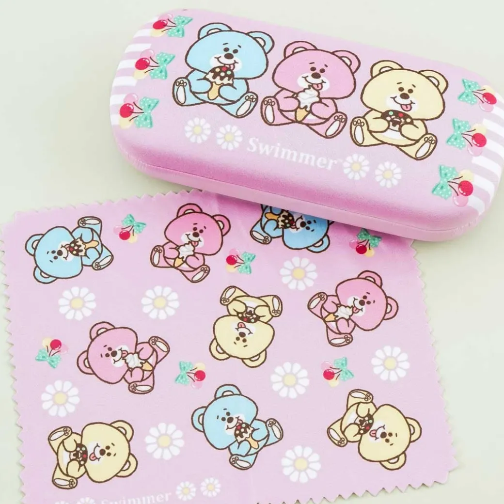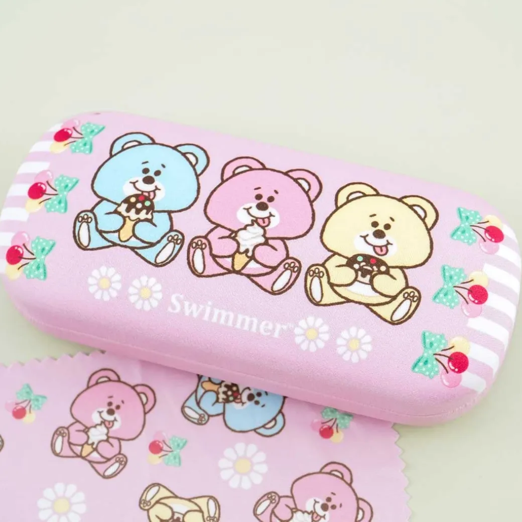 - A kawaii eyeglass hard case with illustrations of cherries, bears eating sweets, and flowers
