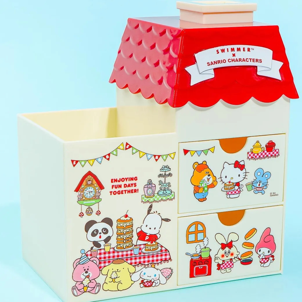 Have fun organizing your writing tools and other craft materials using this super cute multi-storage chest! It’s shaped like a mini-mansion and is decorated with kawaii prints of cuties from Swimmer and Sanrio Characters! There are multiple drawers and a pen storage box.