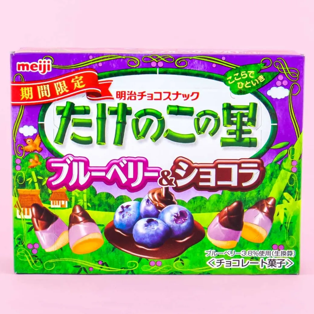 - A box of biscuit treats shaped like bamboo shoots coated in milk chocolate and blueberry cream