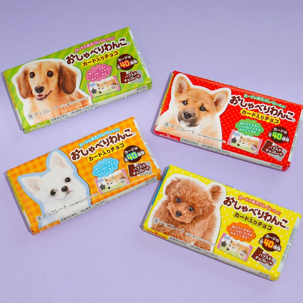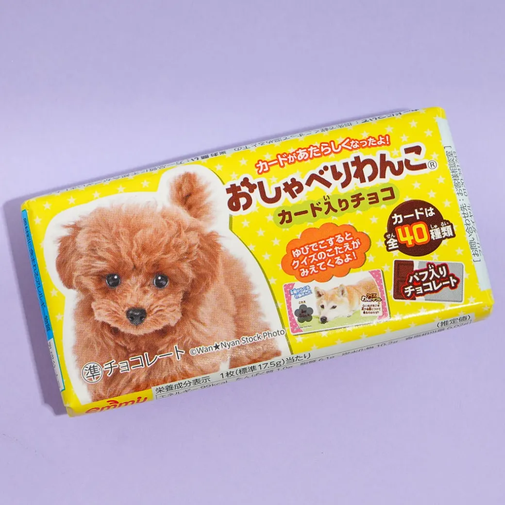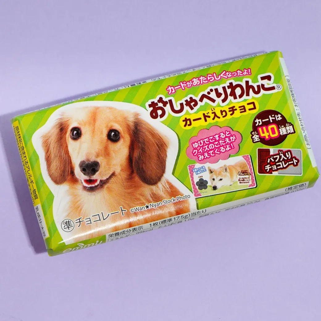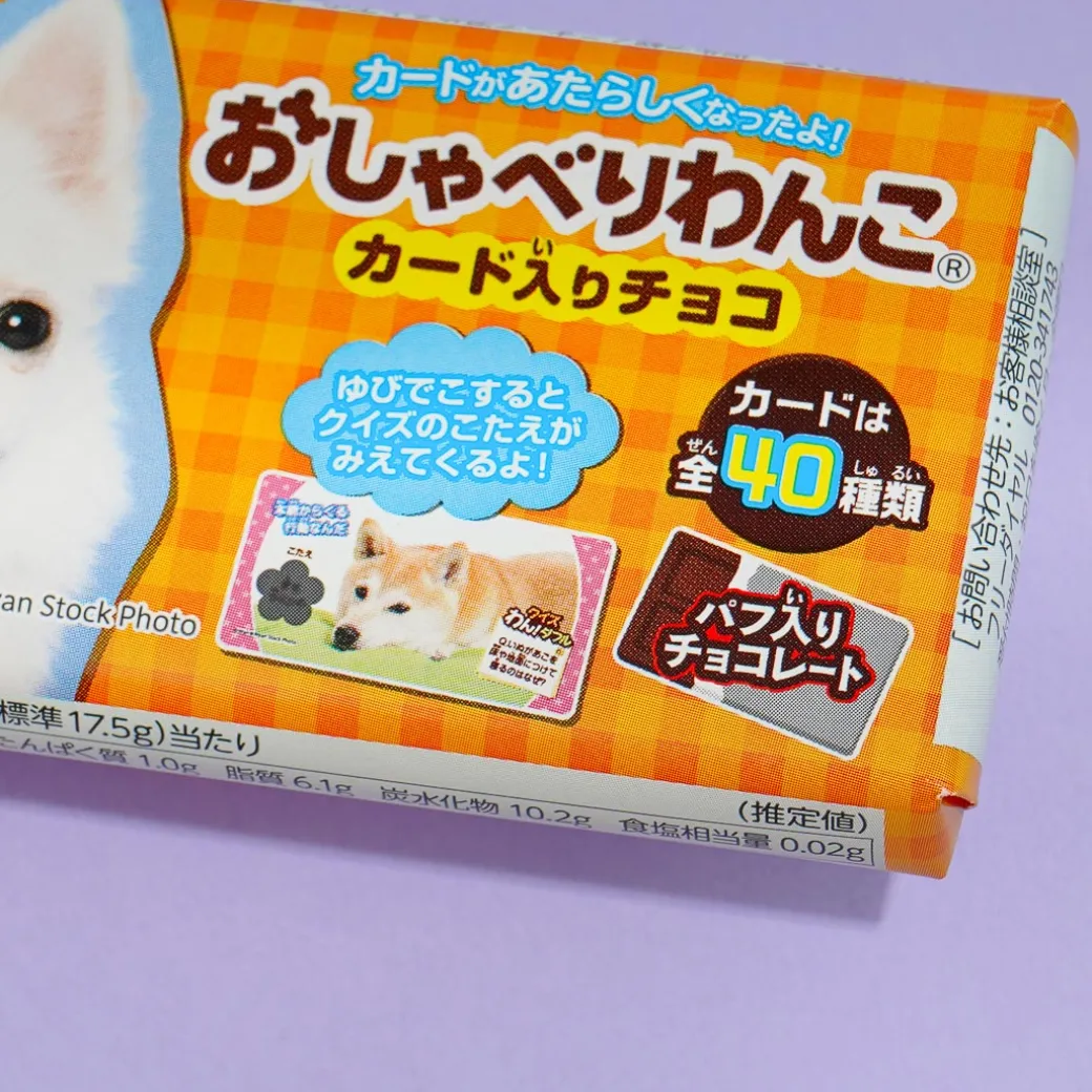Have fun while you enjoy the sweet and crunchy taste of this chocolate bar! The bar features a talking wanko or dog and comes with a card. Collect all 40 possible card designs. When you turn the card, there’s also a quiz you can answer!