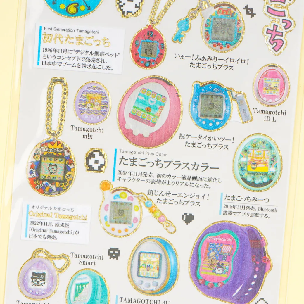 Have fun decorating your scrapbooks using these die-cut stickers! The sheet features illustrations of the different Tamagotchi game models throughout the years! Each piece also has gold foil detailing. You can also add these seals to your growing sticker collection.