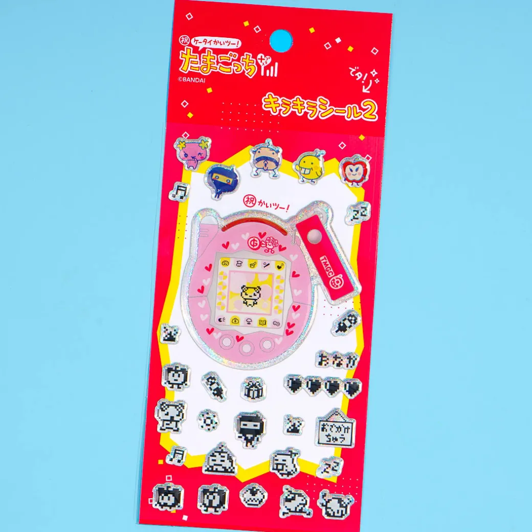 This kawaii sticker sheet features a sparkly sticker shaped like a Tamagotchi toy and metallic stickers featuring the Tamagotchi characters! Use these super cute stickers to jazz up your plain notebook covers.