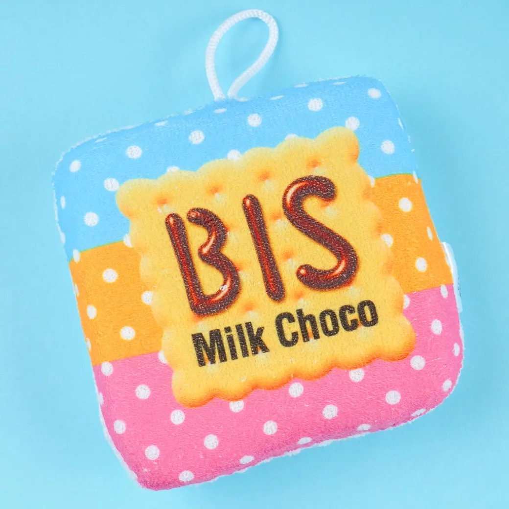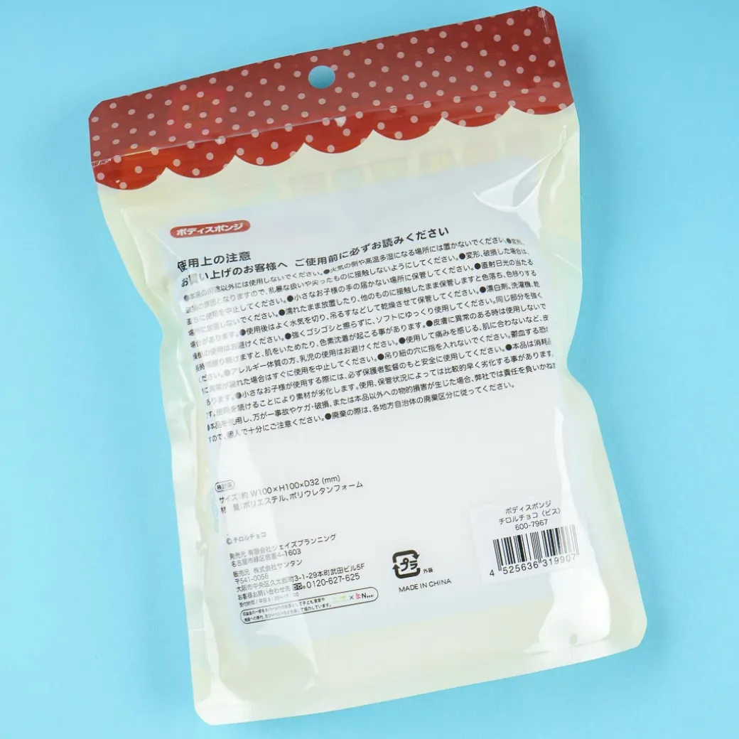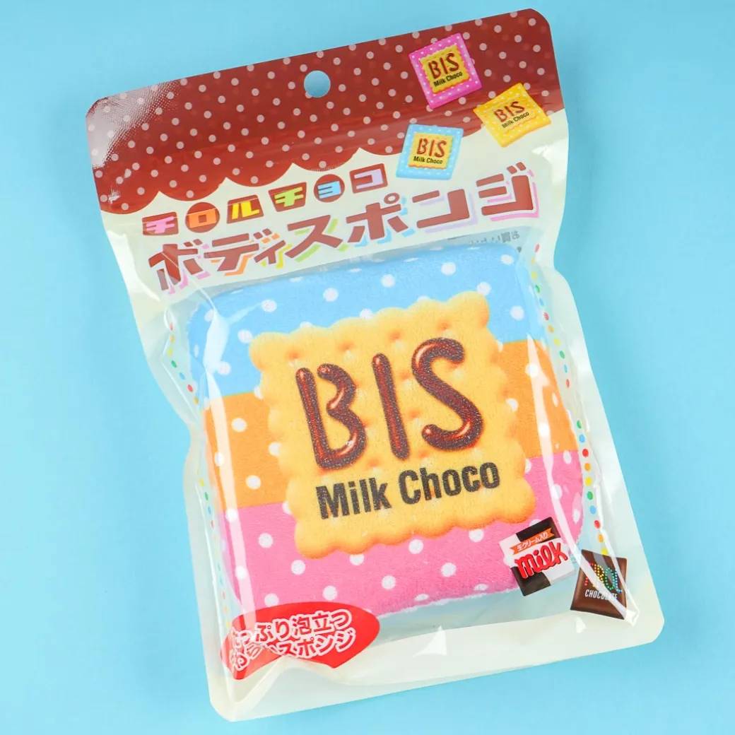 This kawaii body sponge is illustrated with a BIS Milk Choco biscuit and a polka-dot background. It comes with a hanging loop so you keep it clean while using the shower.