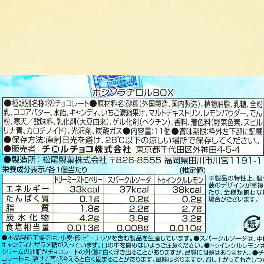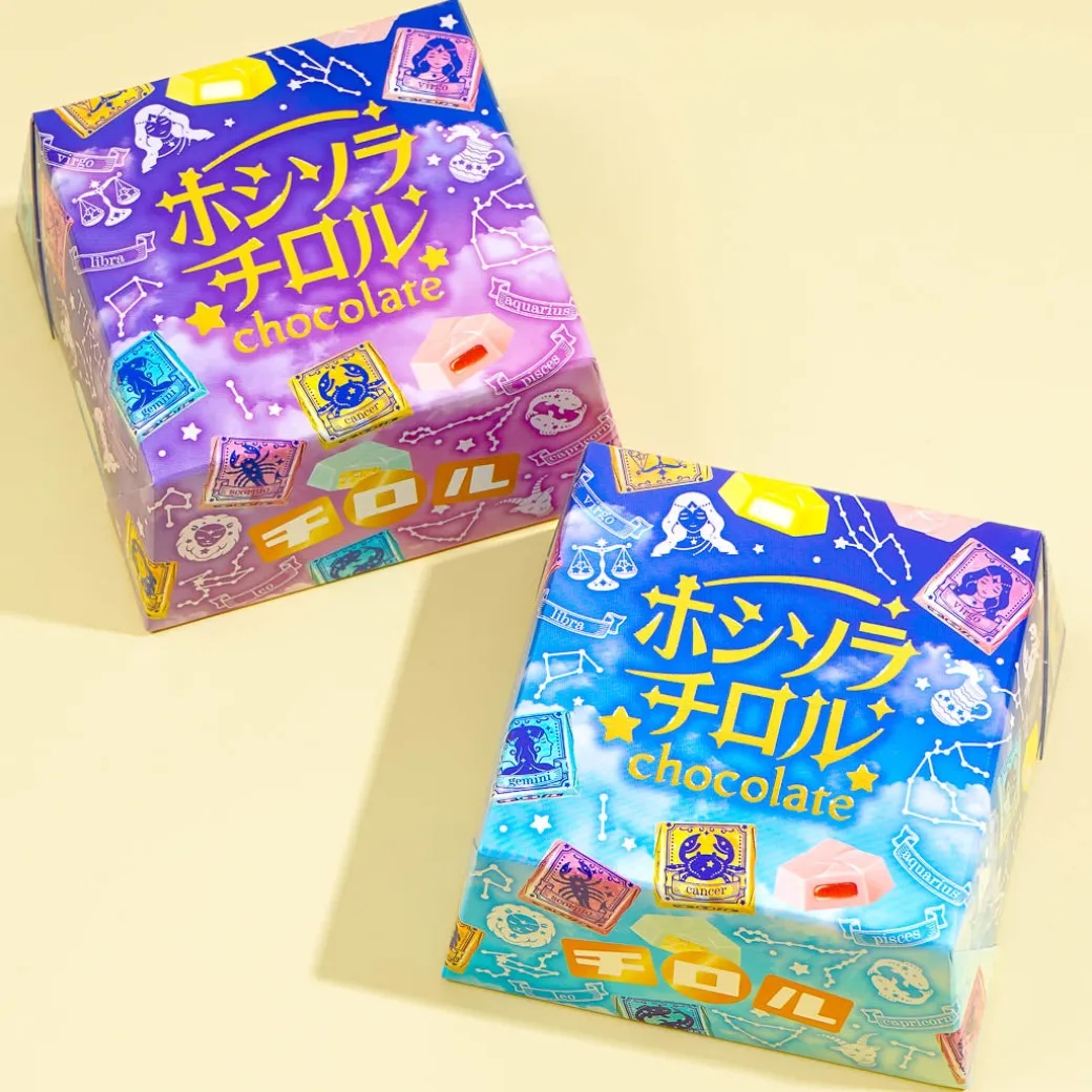 This chocolate treat is perfect for summer festivals! It features three flavors – soda, strawberry soda, and lemon yogurt. The individual packaging has a design that’s based on the twelve constellations, and the box looks like “hoshisora” or starry sky!