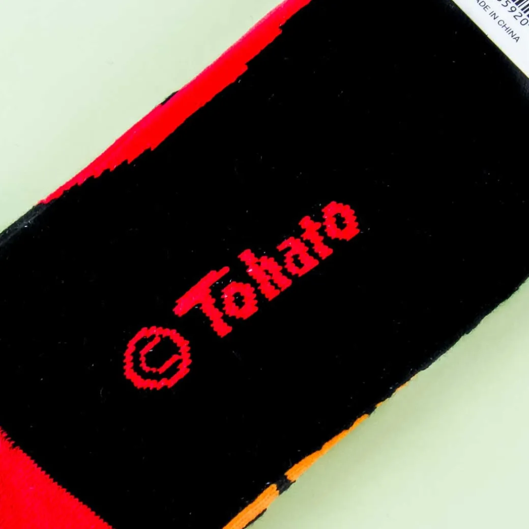 - A pair of socks resembling the Tohato Bokun Habanero Spicy potato rings packaging