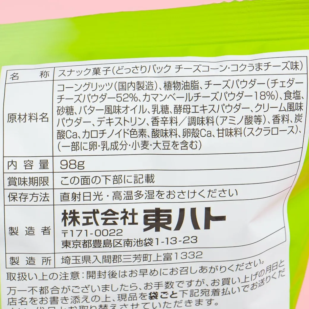 This large pack of savory and puffy corn snacks is perfect for sharing with friends! It features the same light and crispy Tohato corn snacks with a cheddar cheese flavor.