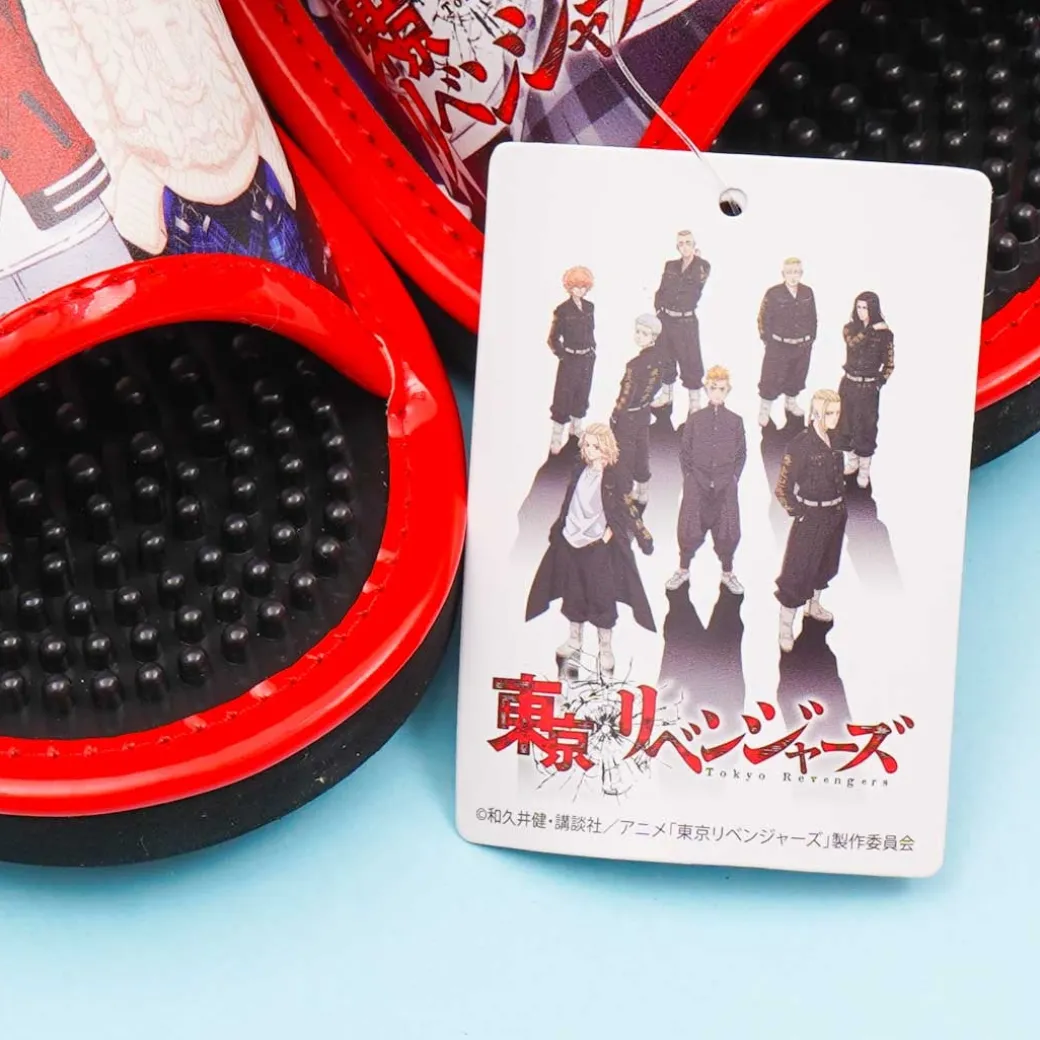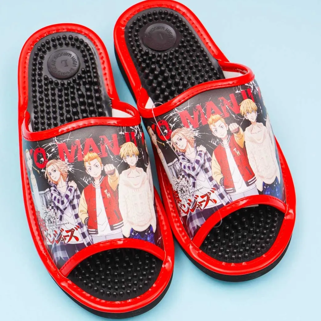 - A red pair of large acupressure slippers featuring Takemichi Hanagaki and Manjiro Sano from Tokyo Revengers