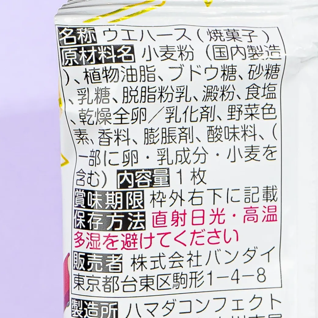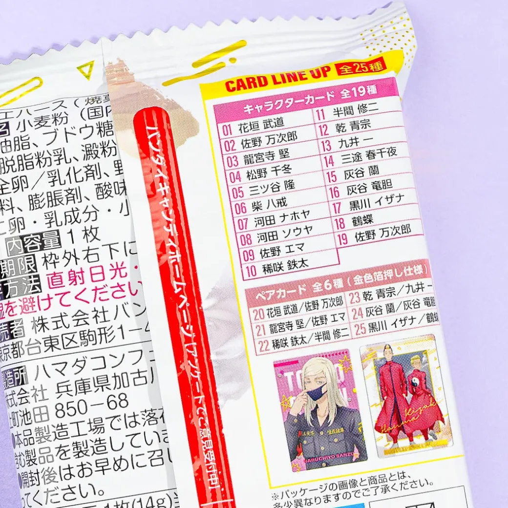 Enjoy this third edition of the Tokyo Revengers wafer with card series! This strawberry cream-flavored wafer comes with a collectible metallic card and packaging featuring illustrations of the anime Tokyo Revengers. Try to collect all the regular character cards and rare foil-stamped cards!