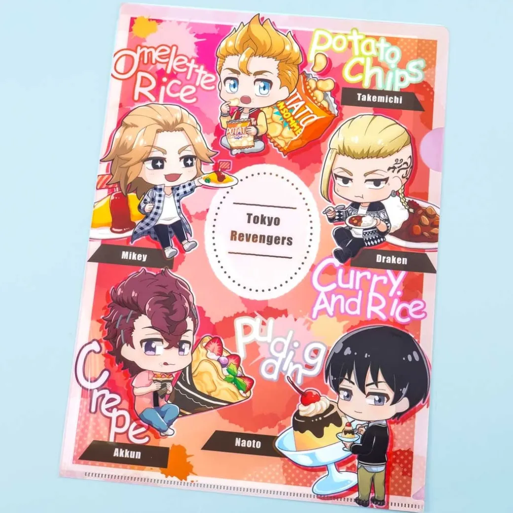 - A kawaii A4 file folder illustrated with chibi Tokyo Revengers characters eating