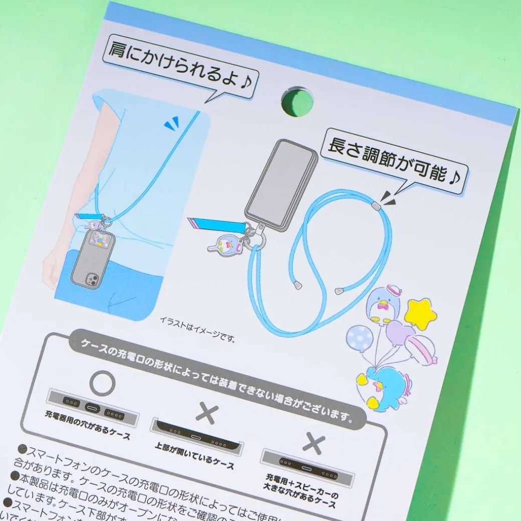 Attach your phone to this strap and sling it over your shoulder like a shoulder bag! The strap is adjustable and comes with a kawaii ribbon and Tuxedosam acrylic charm. Just attach your phone to the metal carabiner and you don’t have to worry about losing your phone!