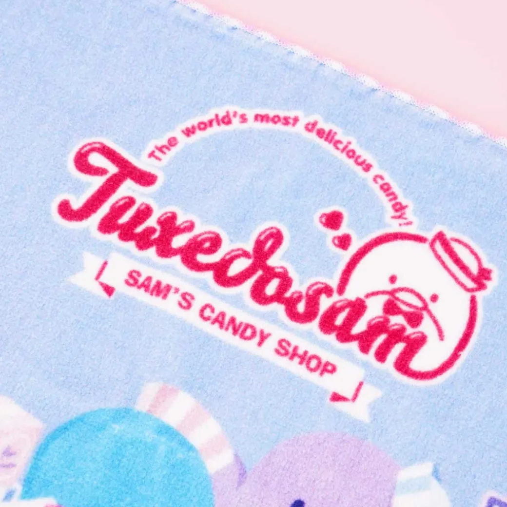 - A cute towel featuring prints of Tuxedosam working in a candy shop