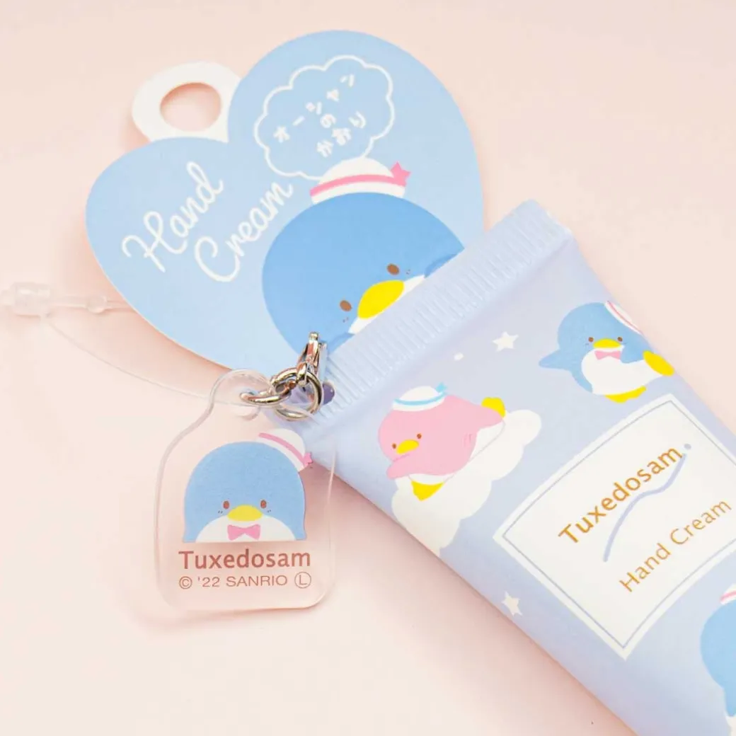 - A super cute tube of hand cream illustrated with Tuxedosam and his friends playing among clouds