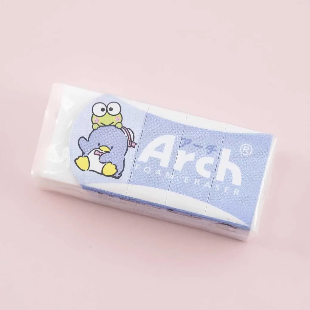 - A kawaii plastic foam eraser that has an arched cardboard case featuring Tuxedosam and Keroppi