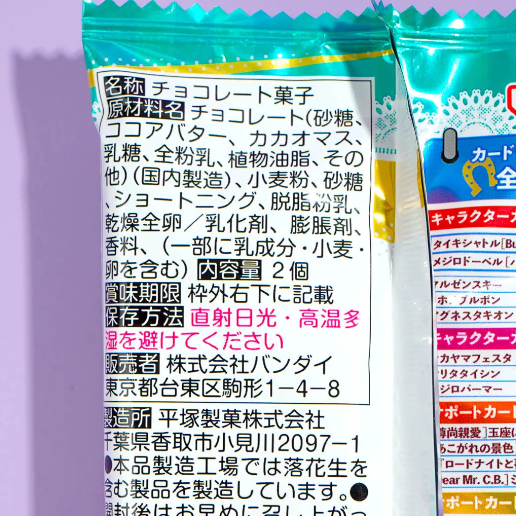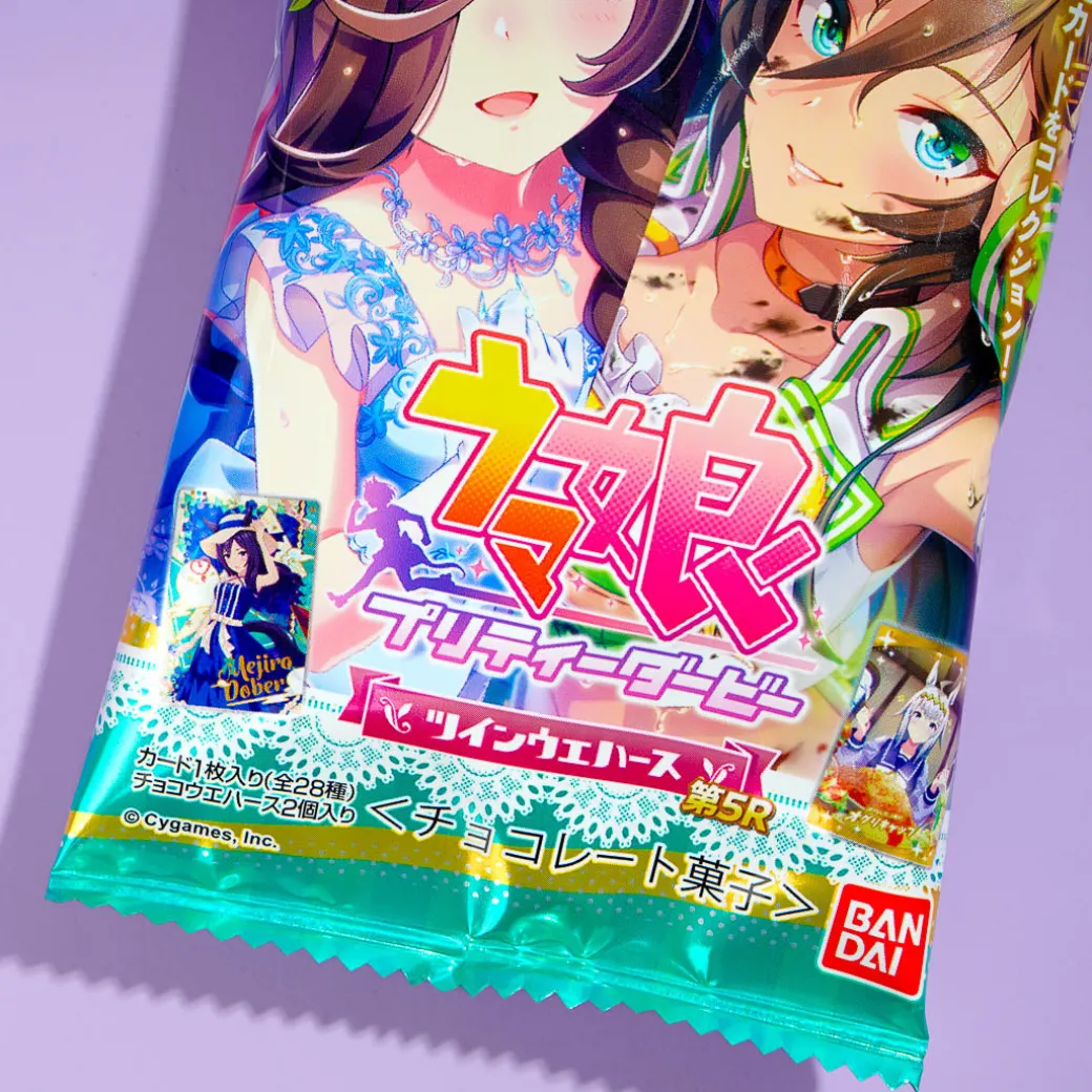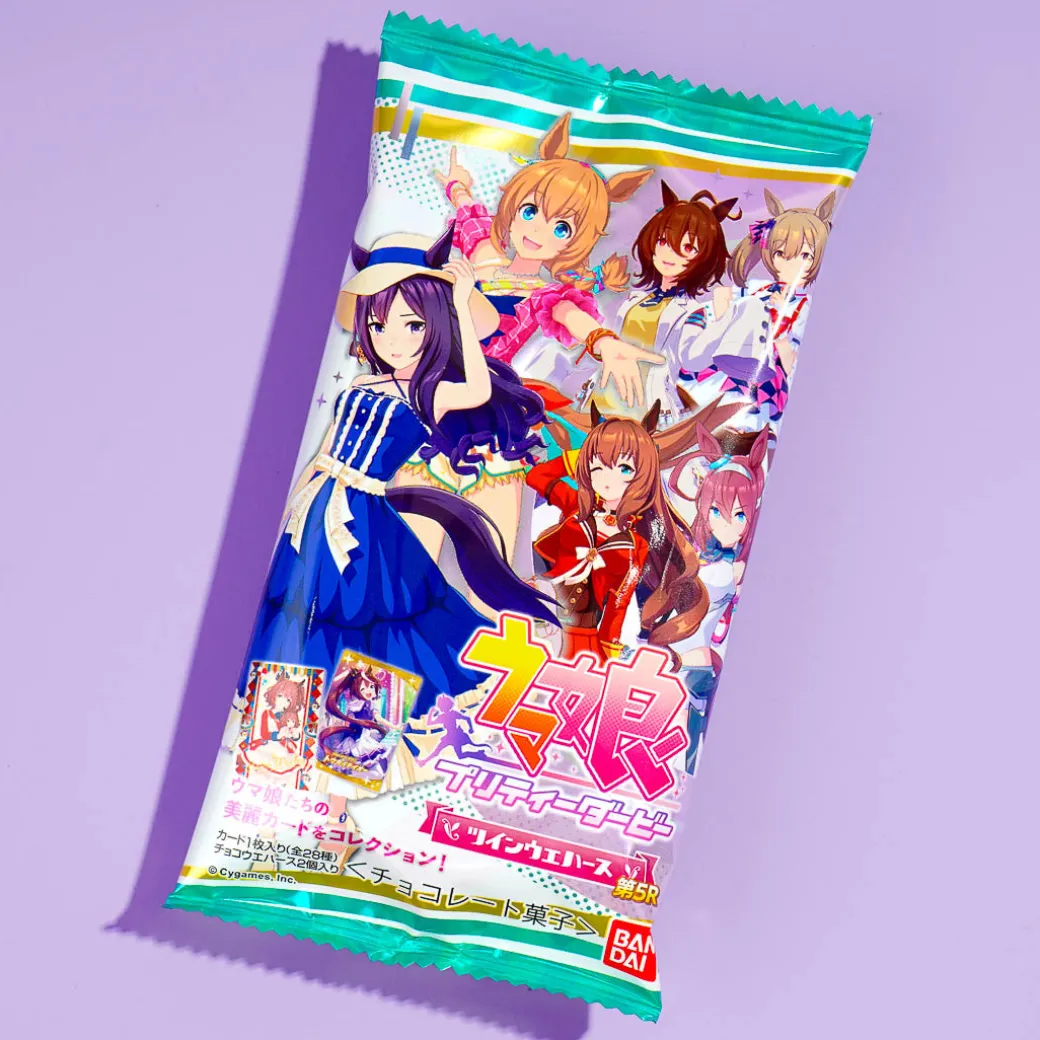 Have fun snacking on these chocolate-flavored twin wafers while expanding your anime collection! This treat is the fifth edition of Bandai snack which features the mobile game and anime series “Uma Musume Pretty Derby.” It comes with a metallic and holographic collectible card!