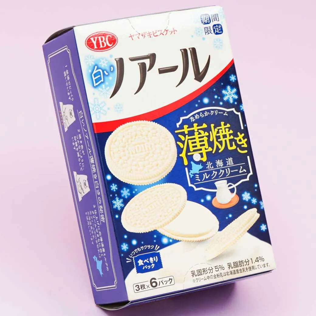 - A box of pure white thin biscuit sandwiches filled with Hokkaido milk cream