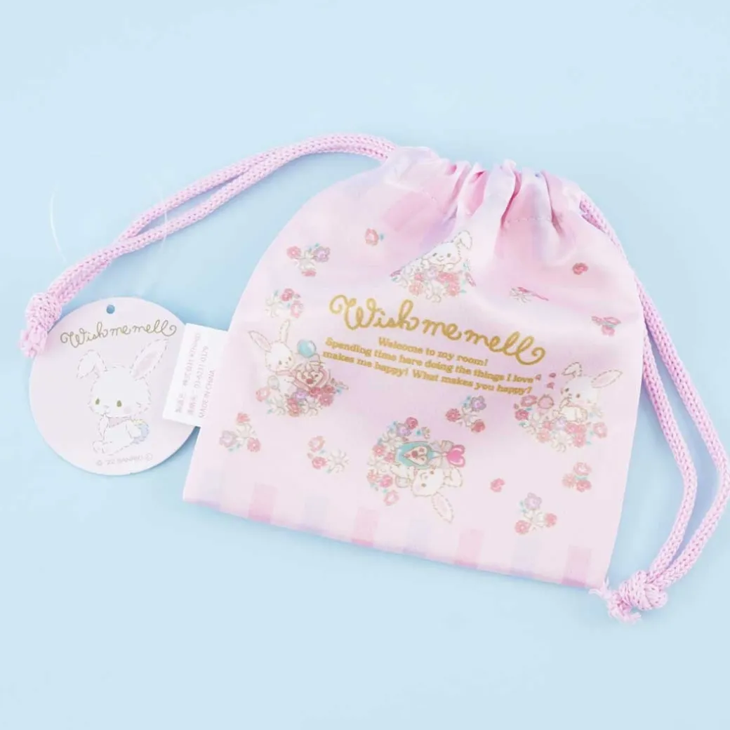 - A kawaii drawstring pouch decorated with prints of Wish Me Mell and flowers